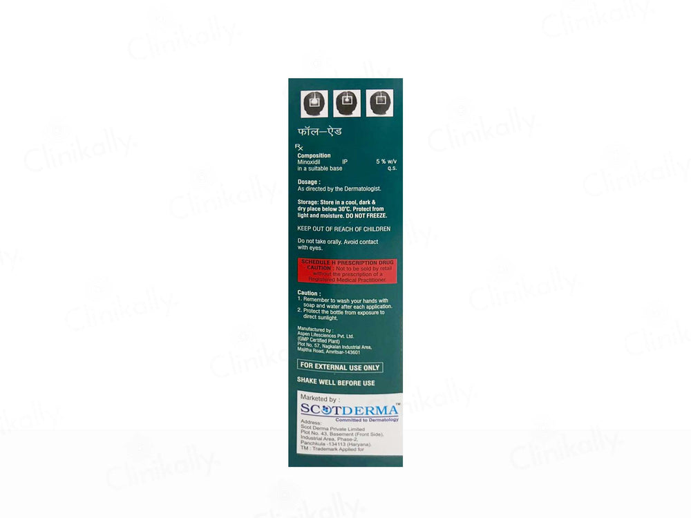 Fall-Aid Topical Solution is a treatment designed to combat androgenetic alopecia (pattern baldness) in men. It contains Minoxidil, a vasodilator that enhances blood flow to hair follicles, stimulating hair growth. Regular application can lead to noticeable improvements in hair density and thickness. This solution is suitable for individuals experiencing male pattern baldness.