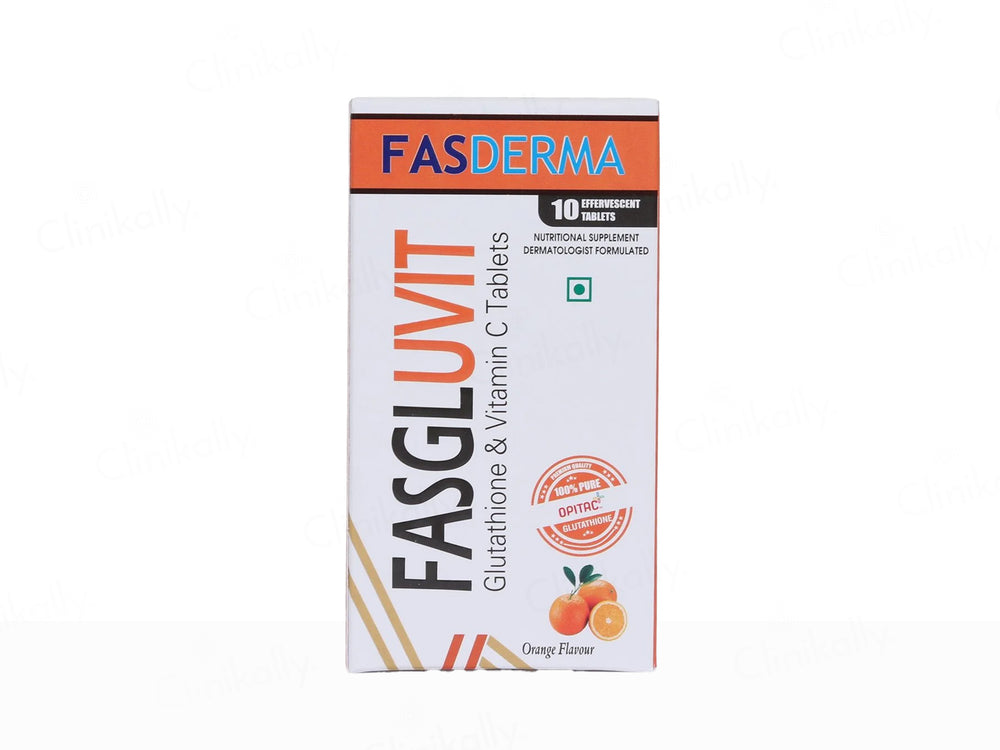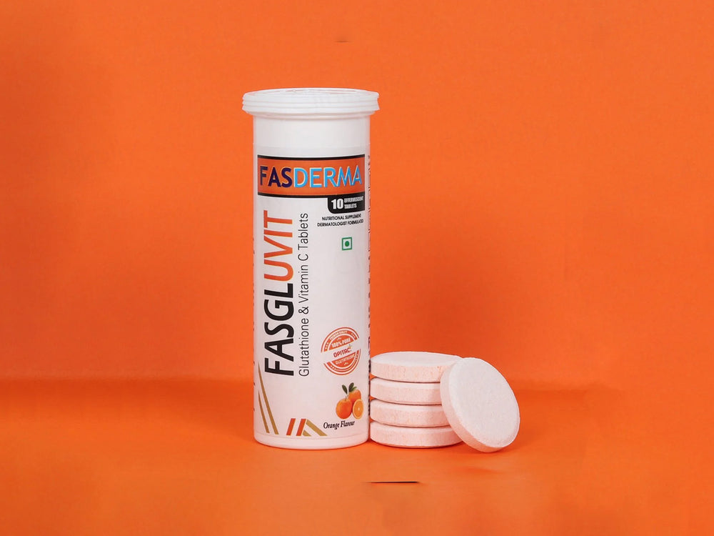 Fasderma Fasgluvit Glutathione & Vitamin C Effervescent Tablet - Orange Flavour is a powerful antioxidant supplement designed to support skin radiance, detoxification, and immunity. With 500 mg of L-Glutathione and 1000 mg of Vitamin C in each tablet, it helps reduce oxidative stress, improve skin tone, and enhance natural glow. The refreshing orange flavour makes it an easy and tasty addition to your routine. It also supports collagen synthesis and helps in skin cell renewal and overall wellness.