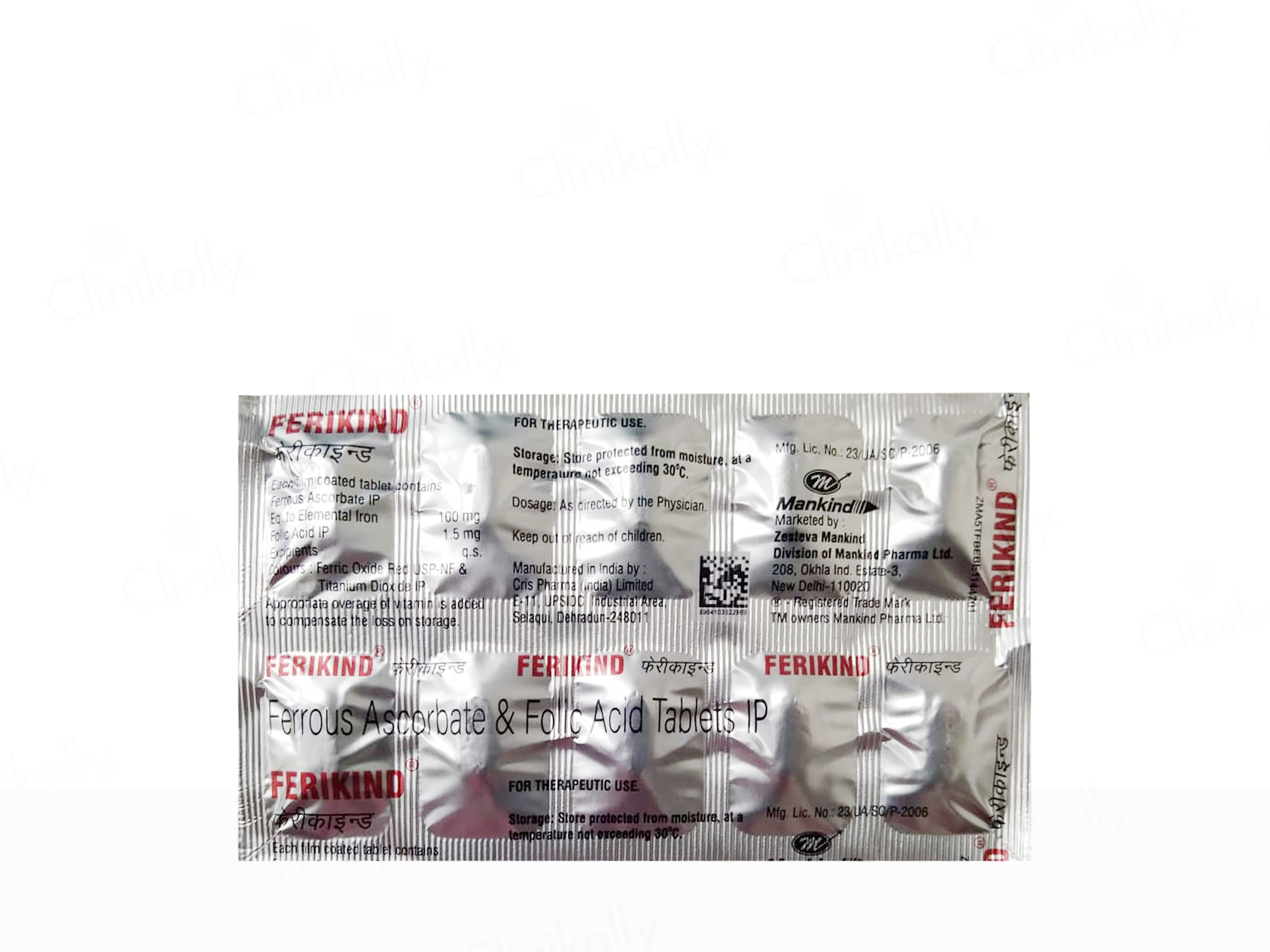 Ferikind Tablet is an iron supplement containing Ferrous Ascorbate and Folic Acid that helps prevent and treat iron deficiency anemia and supports healthy red blood cell formation.
