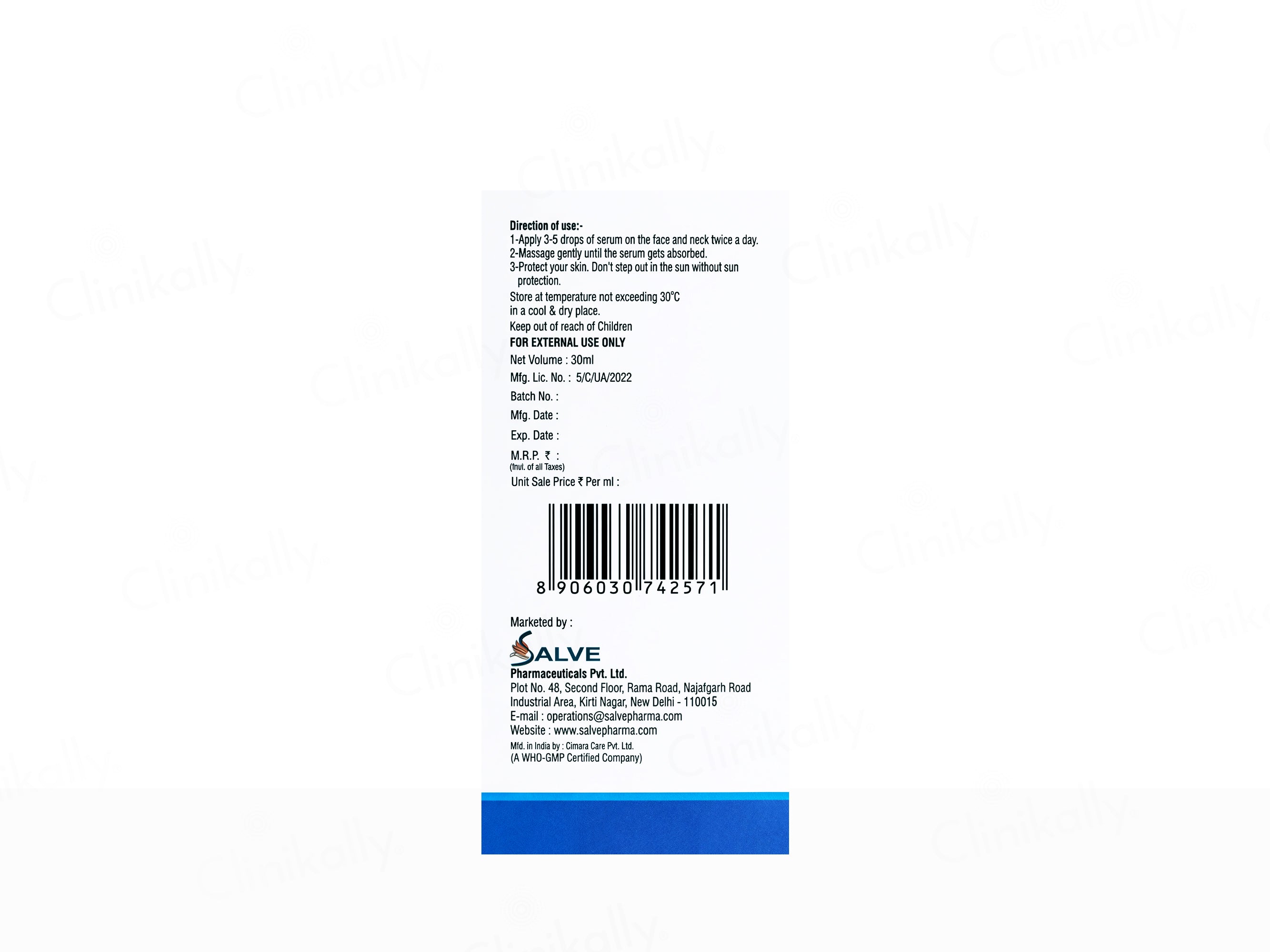 Firmer-GA Face Serum is an advanced skincare formulation by Salve Pharmaceuticals designed to improve overall skin clarity, firmness, and radiance while addressing multiple visible skin concerns. As per the images, Firmer-GA Face Serum is formulated with key active ingredients including L-Glutathione, Alpha Arbutin, Niacinamide, Hyaluronic Acid, Acetyl Heptapeptide-4, Glycerine, Vitamin E, Xanthan Gum, Aqua, Caprylyl Glycol, Diethylene Glycol Monoethyl Ether, Allantoin, Sodium Metabisulfite, Sodium Hydroxide, Iscaguard PEG, and Purified Water, which work synergistically to brighten the complexion, reduce dark spots, minimize blemishes and wrinkles, fade scars, smooth skin texture, even out skin tone, and soothe redness. Firmer-GA Face Serum helps enhance skin luminosity while supporting hydration and skin barrier comfort, making it suitable for regular facial care. The serum absorbs easily into the skin and is intended for use on both the face and neck. For best results, apply 3–5 drops of Firmer-GA Face Serum on clean face and neck twice daily, massage gently until fully absorbed, and ensure sun protection before stepping outdoors as directed on the packaging.