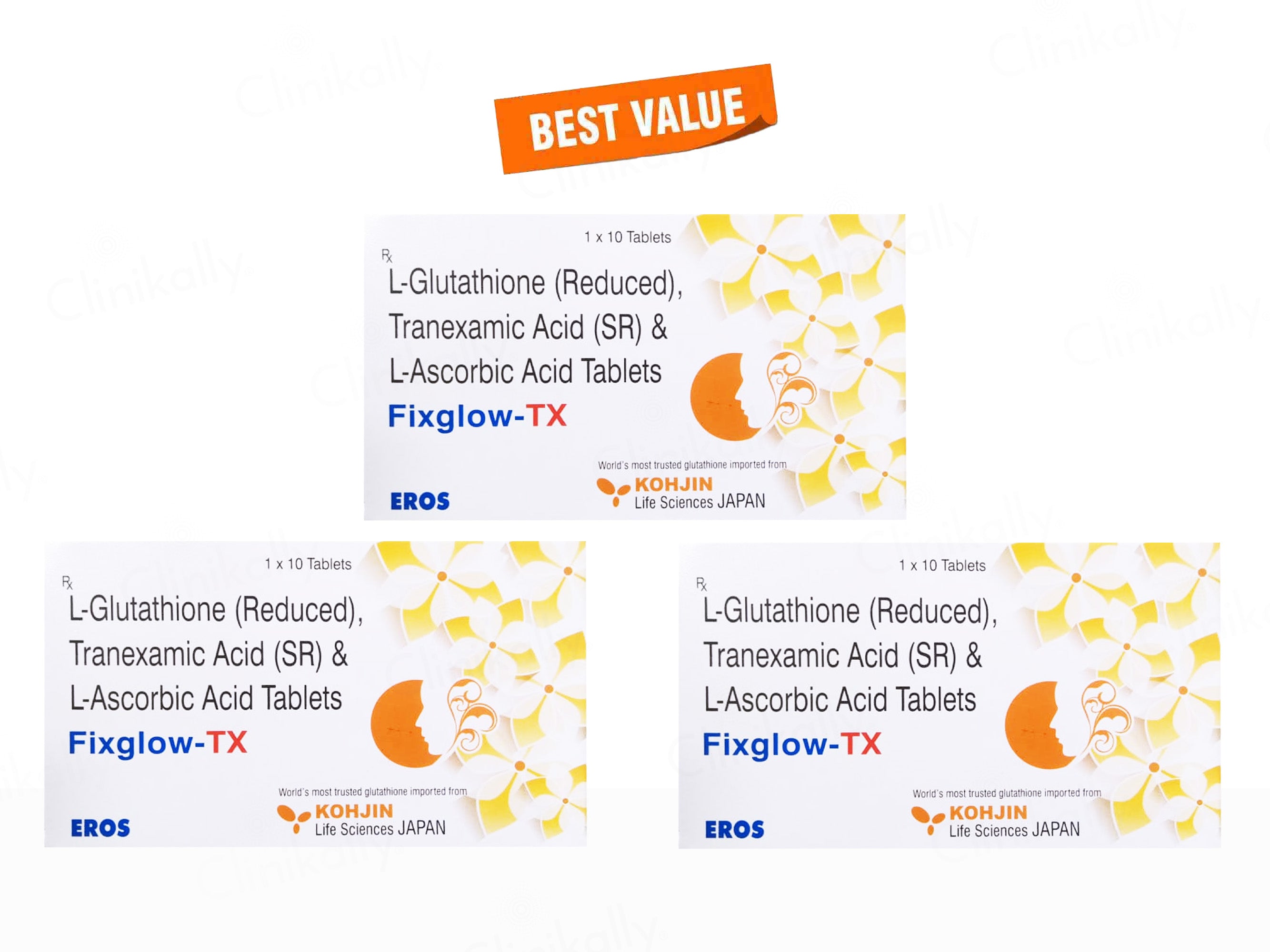 Fixglow-TX Tablet is an advanced skin-brightening and antioxidant supplement that combines the powerful benefits of L-Glutathione (250mg), Tranexamic Acid (250mg), and L-Ascorbic Acid (500mg) to improve skin tone, reduce pigmentation, and combat oxidative stress. L-Glutathione works at the cellular level to lighten skin and detoxify, Tranexamic Acid reduces melanin synthesis and dark spots, while L-Ascorbic Acid boosts collagen and enhances radiance. Together, they work synergistically to restore a healthy, luminous complexion and support overall skin health when used consistently under medical supervision.