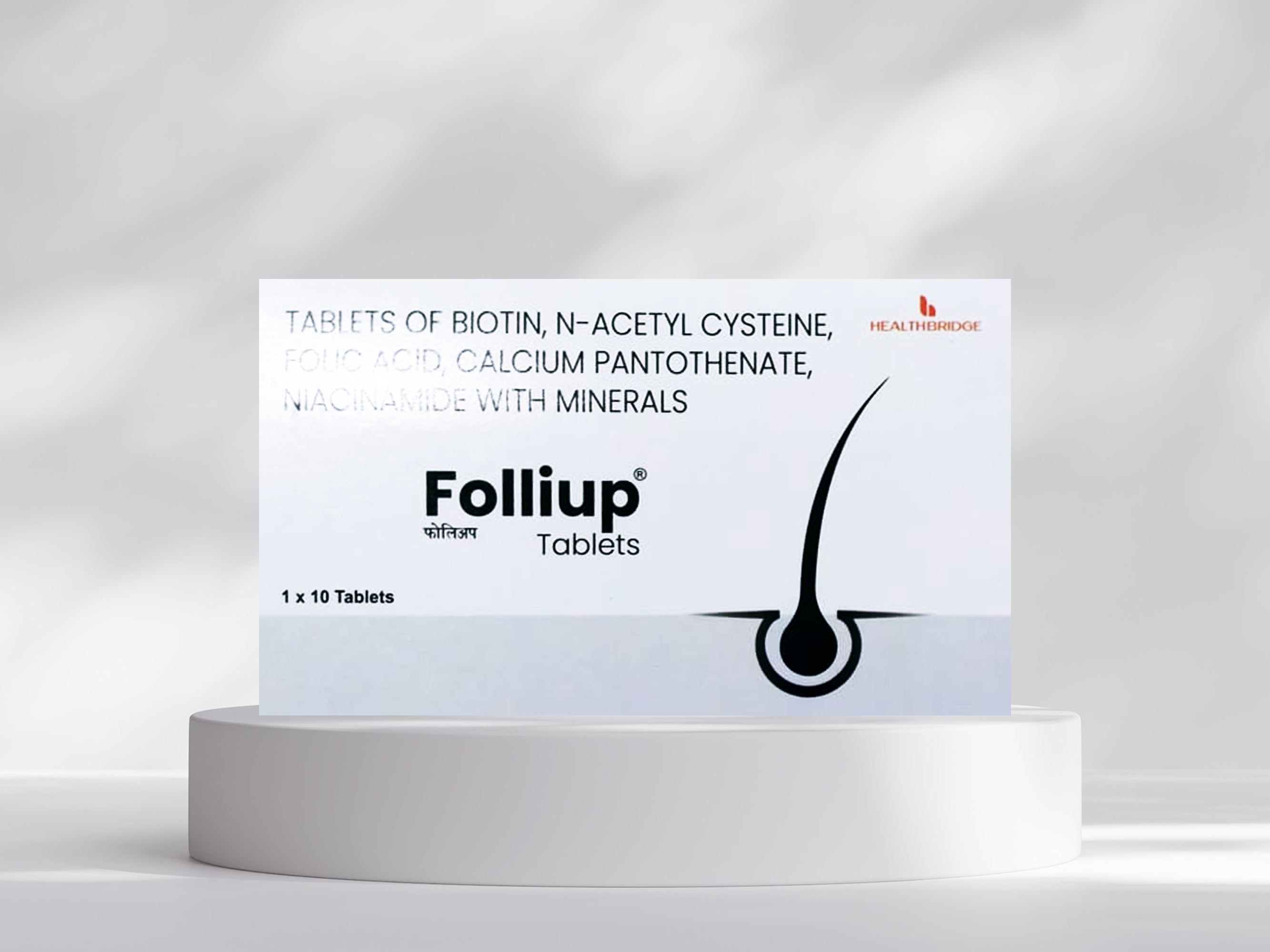 Folliup Hair Growth Supplement Tablet is a nutraceutical formulation designed to strengthen hair roots, reduce hair fall, and promote healthy growth by combining a blend of vitamins, amino acids, and minerals. It contains Biotin to support keratin production, N-Acetyl Cysteine for antioxidant protection, and Calcium Pantothenate to improve hair structure and strength, while Folic Acid and Niacinamide aid in cellular regeneration and scalp nourishment. The tablet also includes essential minerals such as Zinc, Copper, Manganese, Selenium, and Iron that help maintain follicle health and prevent deficiencies linked to hair thinning. Regular use of Folliup Tablet helps restore hair vitality, supports stronger and shinier strands, and improves overall scalp health.
