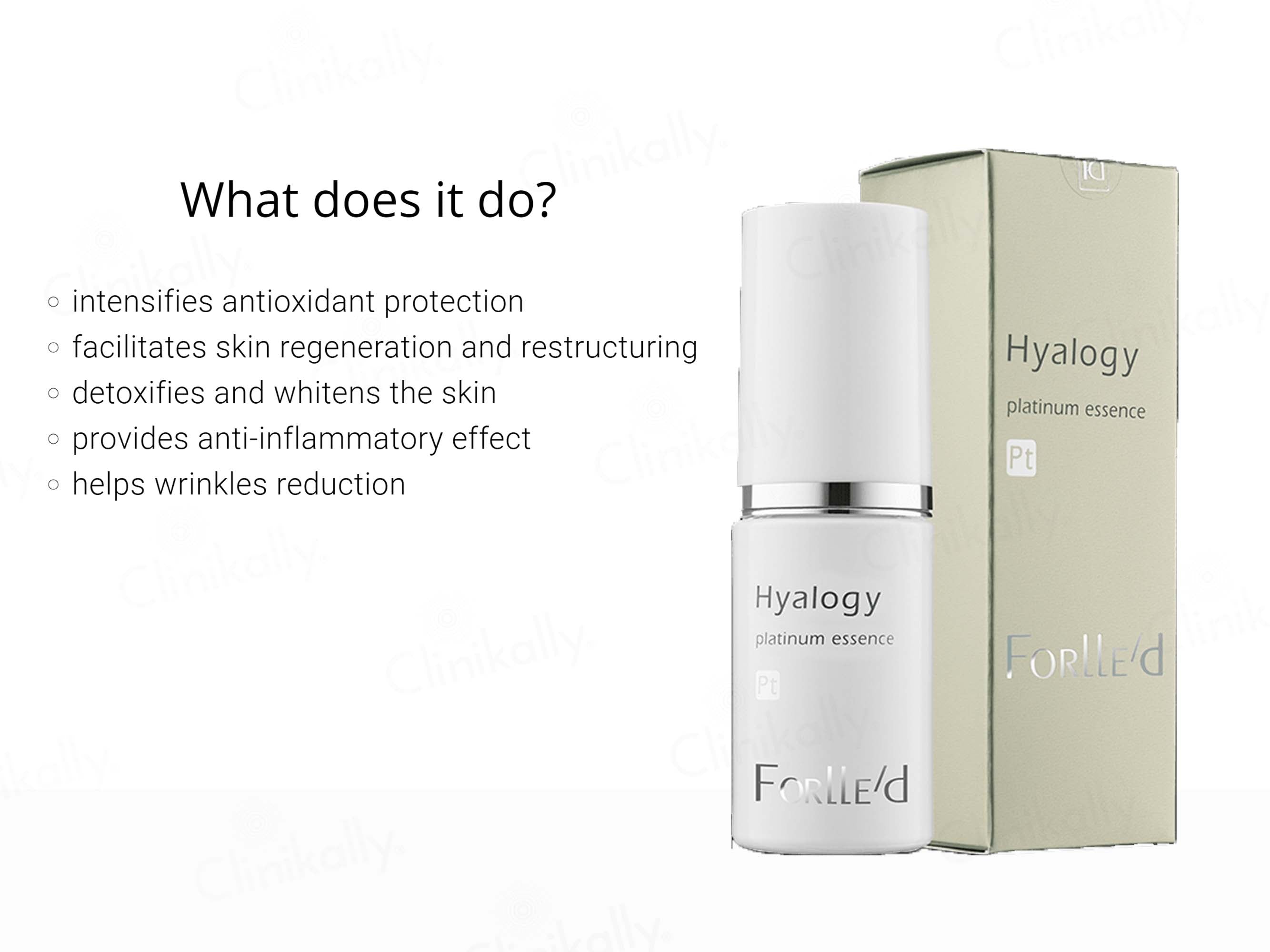 Forlle'd Hyalogy PT Platinum Essence is used to hydrate, repair, and rejuvenate the skin, reducing signs of aging such as fine lines and wrinkles.