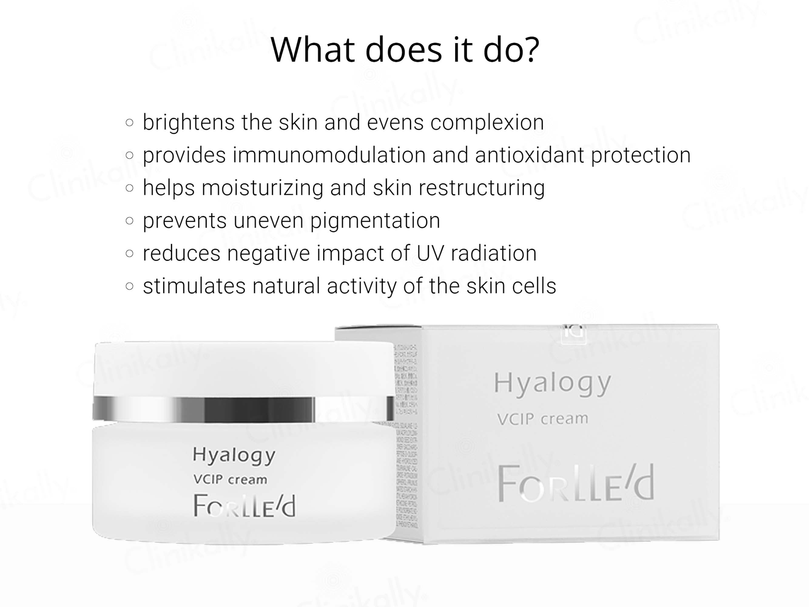 Forlle'd Hyalogy VCIP Cream is a lightweight day and night cream formulated with a stable, oil-soluble form of vitamin C to rejuvenate skin cells, prevent uneven pigmentation, and brighten the complexion.