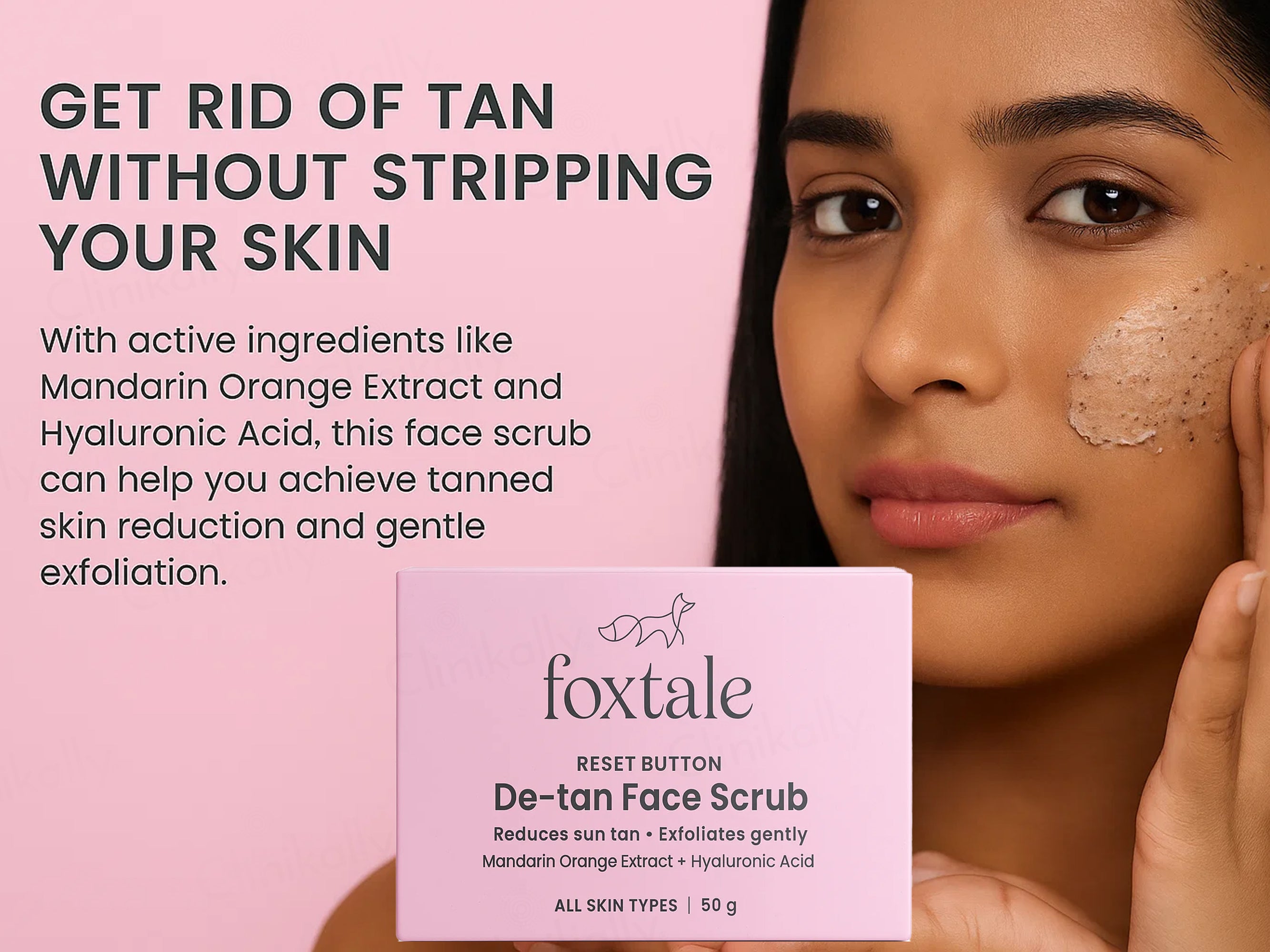 Foxtale De-tan Face Scrub is a gentle exfoliator that removes tan, cleans pores, and brightens dull skin for a smoother, radiant complexion.