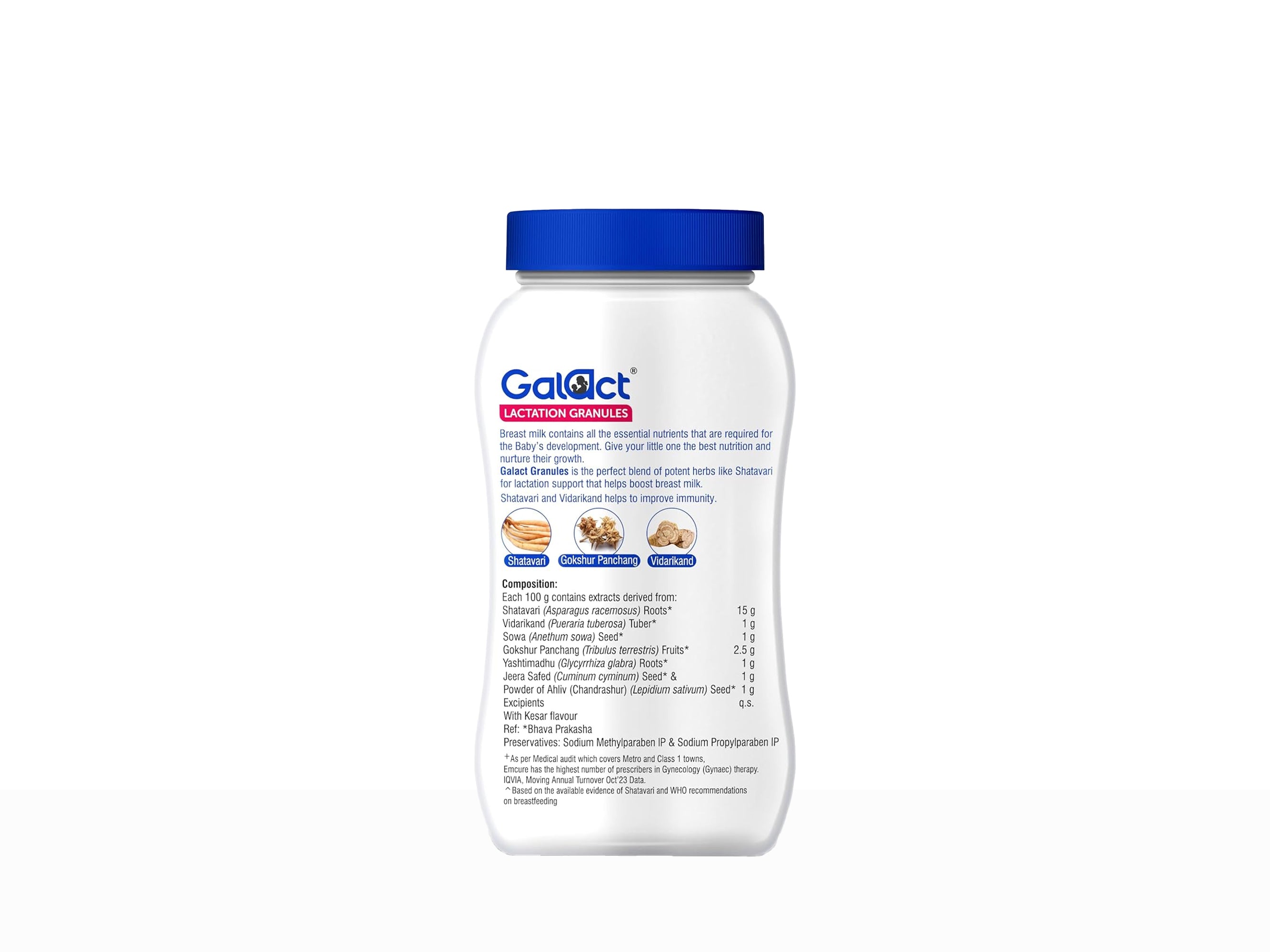 Galact Lactation Granules is a natural, Ayurvedic supplement crafted to support breastfeeding mothers. This potent blend combines Shatavari, Vidarikand, and Sowa to enhance milk production, while Gokshur Panchang and Yashtimadhu promote digestion and overall wellness. Infused with Jeera Safed and Ahilv powder, it offers a mild, aromatic flavor, making it easy to consume. Designed for new moms, this granule mix nourishes the body, boosts lactation, and ensures a healthy milk supply for infants, all while supporting postpartum recovery.