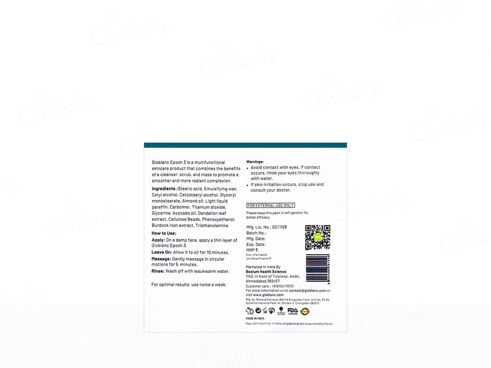 Glo Blanc Eposh-3 Tri Active Exfoliating Cream Cleanser is a 3-in-1 skincare solution that works as a cleanser, scrub, and mask to deliver visibly smoother and radiant skin. Enriched with almond oil, avocado oil, dandelion leaf extract, and burdock root extract, it gently removes impurities, unclogs pores, and polishes away dead skin cells. Its creamy texture nourishes while cellulose beads provide gentle exfoliation for a refreshed glow. Ideal for all skin types, this multifunctional exfoliating cream promotes even texture, hydration, and luminosity — your ultimate step towards flawless, rejuvenated skin.