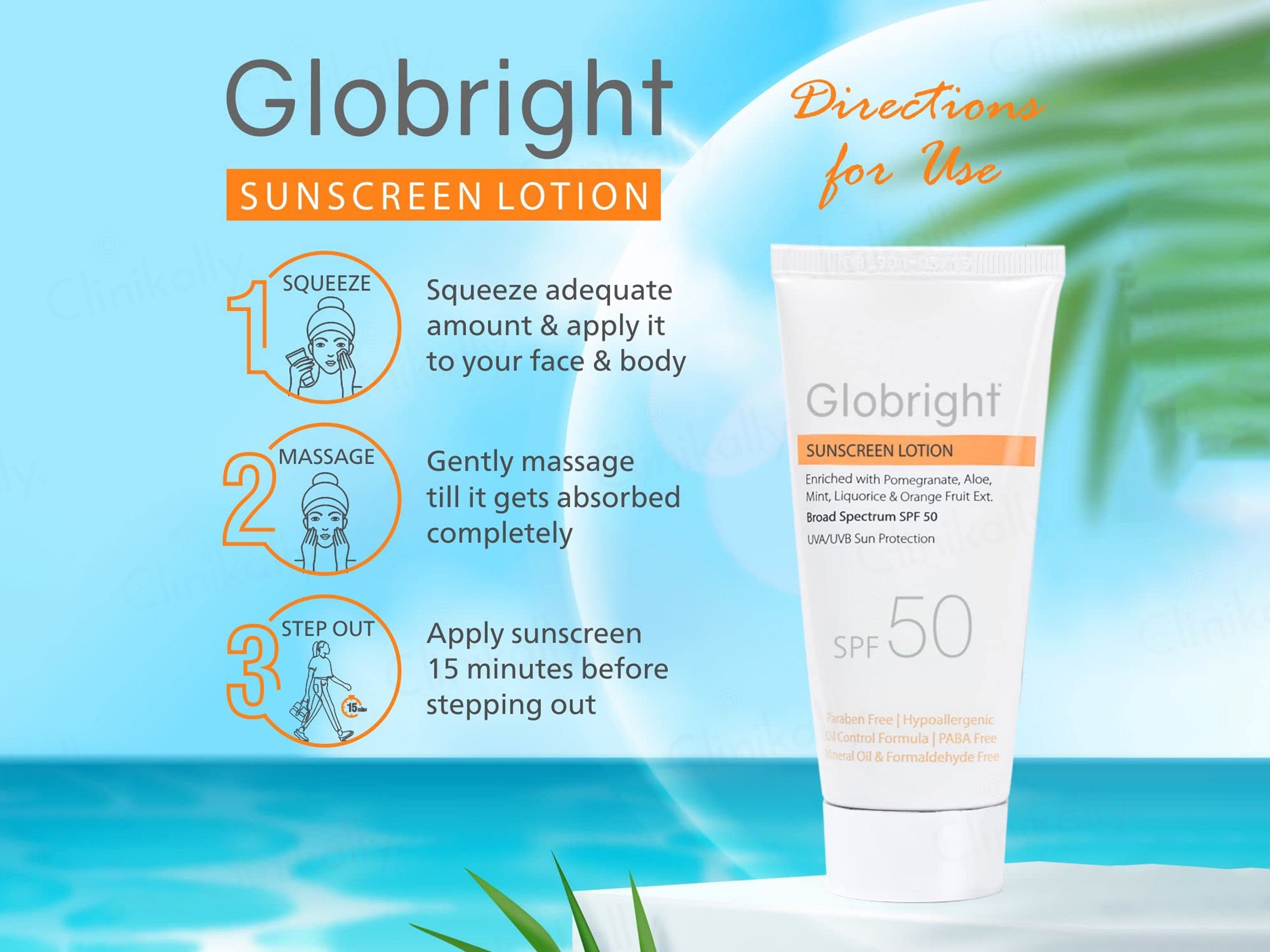 - Apply a generous amount of Globright Sunscreen Lotion SPF 50 to clean, dry skin.