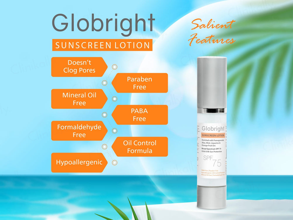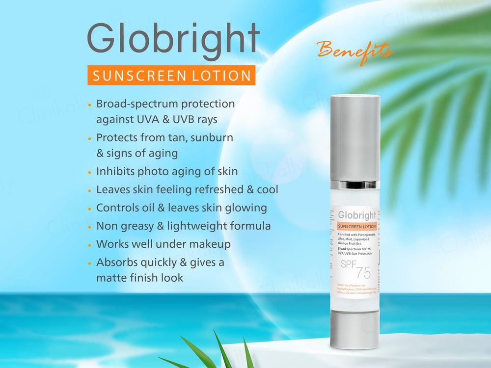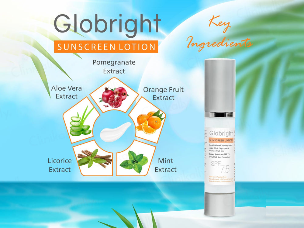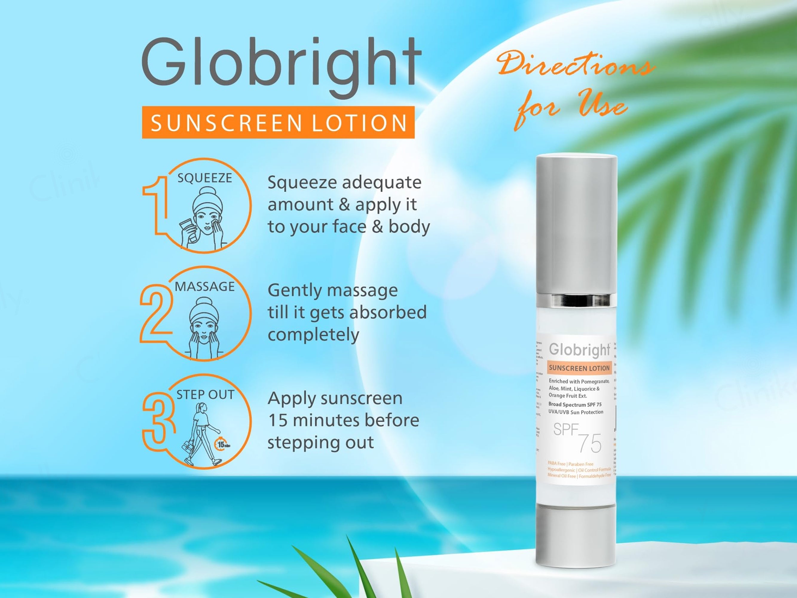 - Apply a generous amount of Globright Sunscreen Lotion SPF 75 to clean, dry skin.