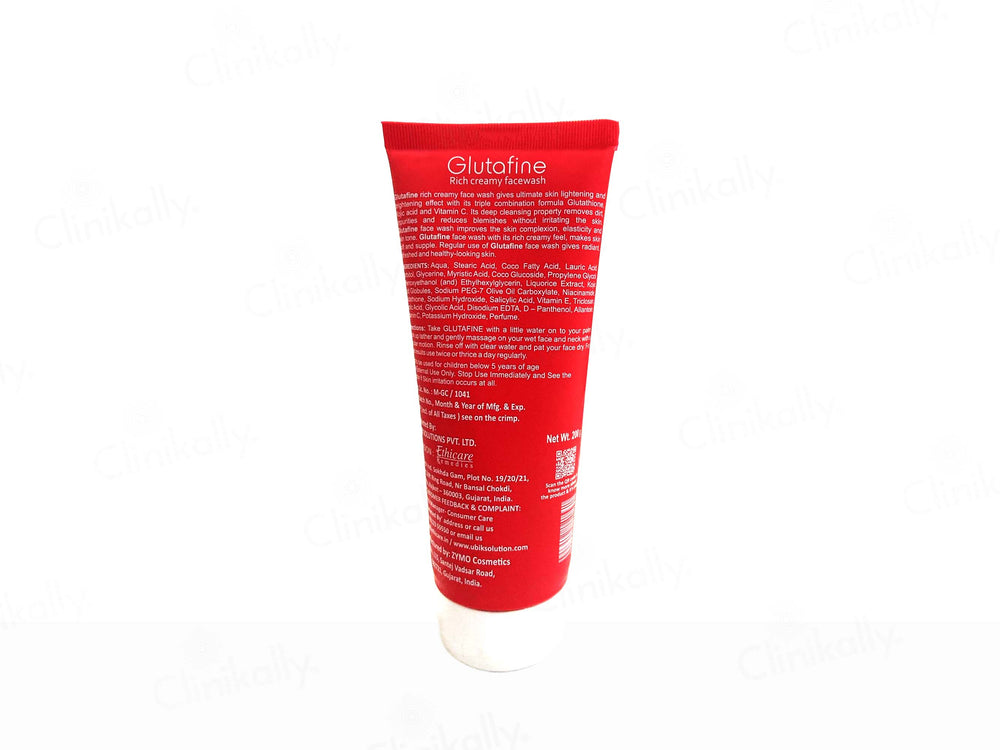 Key ingredients in Glutafine Rich Creamy Face Wash include glutathione, kojic acid, Vitamin C, niacinamide, and salicylic acid.