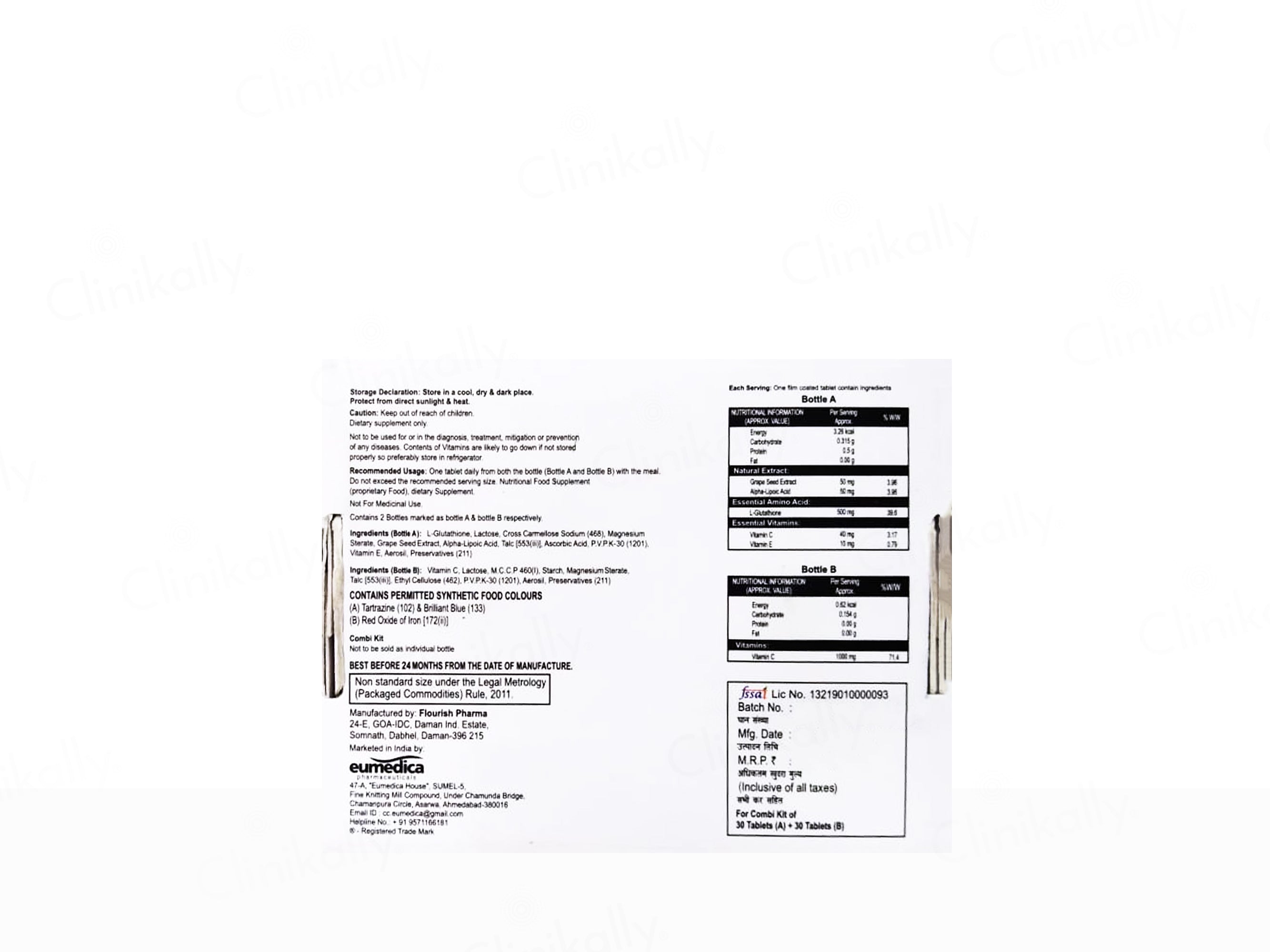 Glutavit Skin Whitening & Age Defying Health Supplement Combo Kit is a dual-strip nutraceutical designed to support radiant, youthful skin by combining essential antioxidants, amino acids, vitamins, and plant extracts. With ingredients like glutathione, grape seed extract, alpha-lipoic acid, and vitamins C & E, it works from within to reduce oxidative stress, even out skin tone, and delay signs of aging. The two-part formulation (Strip A & B) ensures a synergistic effect for visible brightening and improved skin resilience when used consistently with meals.