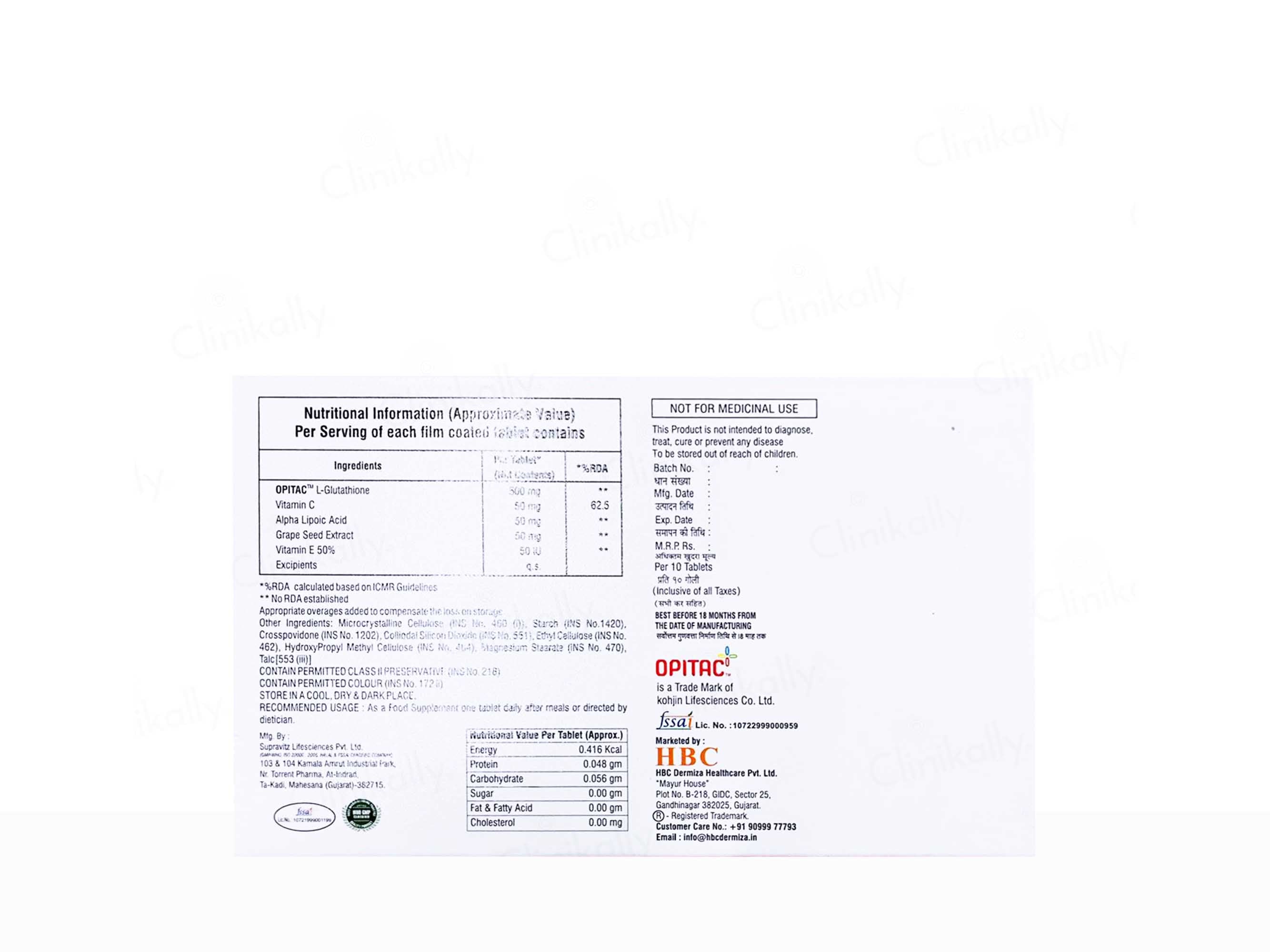 The tablet contains glutathione and other ingredients that lighten and brighten the skin, reduce dark spots, and support liver health and detoxification.