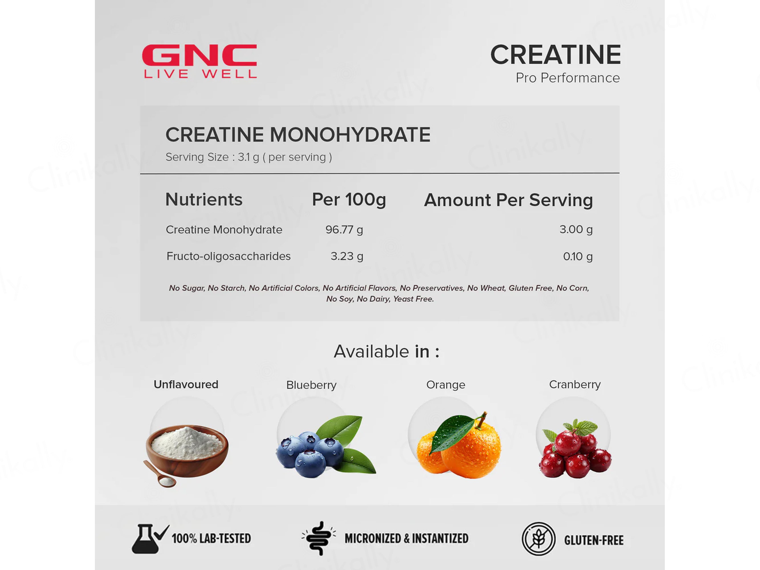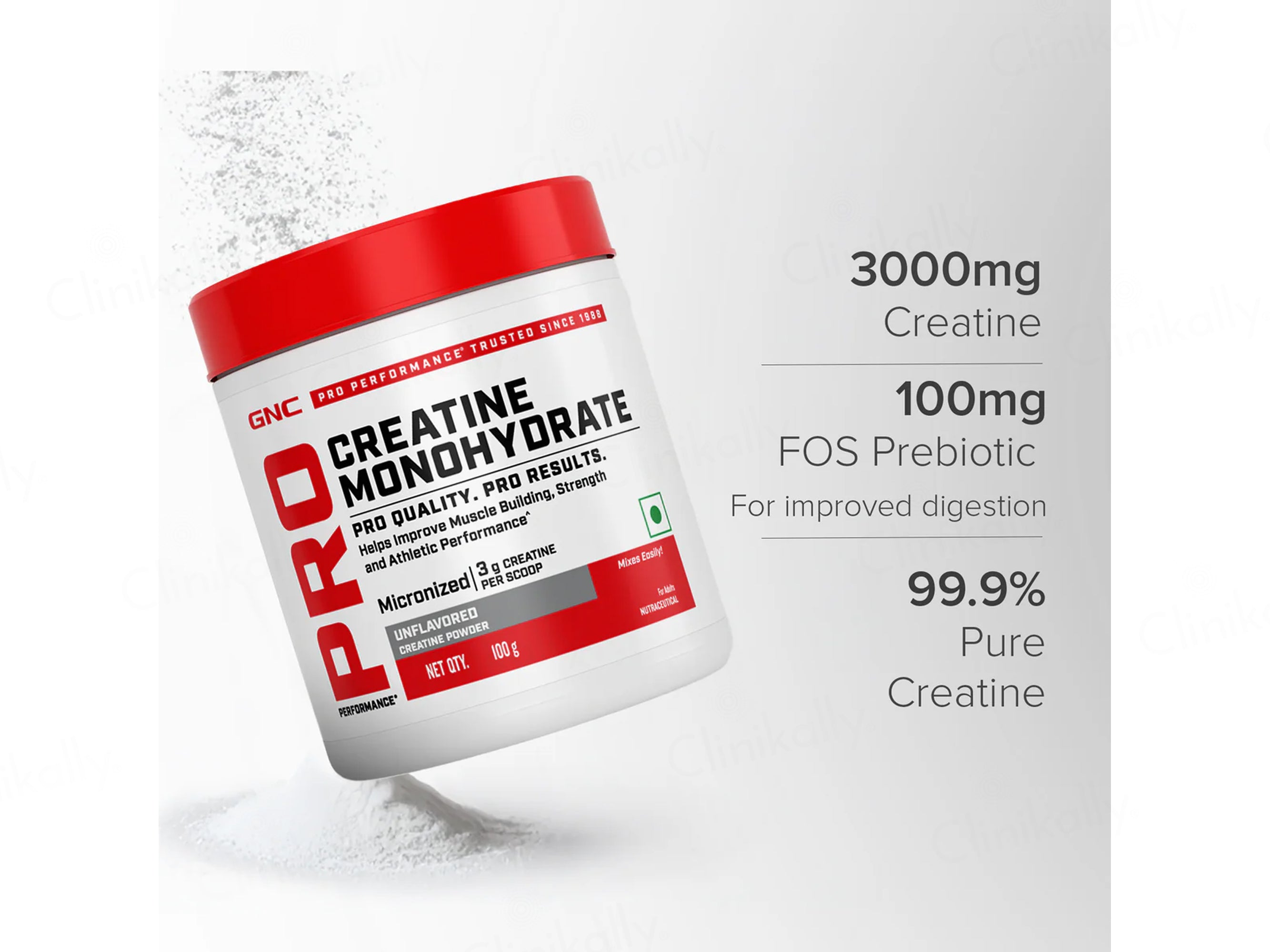 GNC Pro Performance Creatine Monohydrate Powder - Unflavored is a micronized creatine formula designed to support improved muscle building, strength, and athletic performance, delivering 3g Creatine per scoop as highlighted on the label. The formula contains key ingredients including Creatine Monohydrate as the primary performance-enhancing compound along with Fructooligosaccharides, helping support effective supplementation as part of daily usage. This unflavored creatine powder is intended to enhance workout performance and strength output when combined with regular resistance training and a balanced diet.