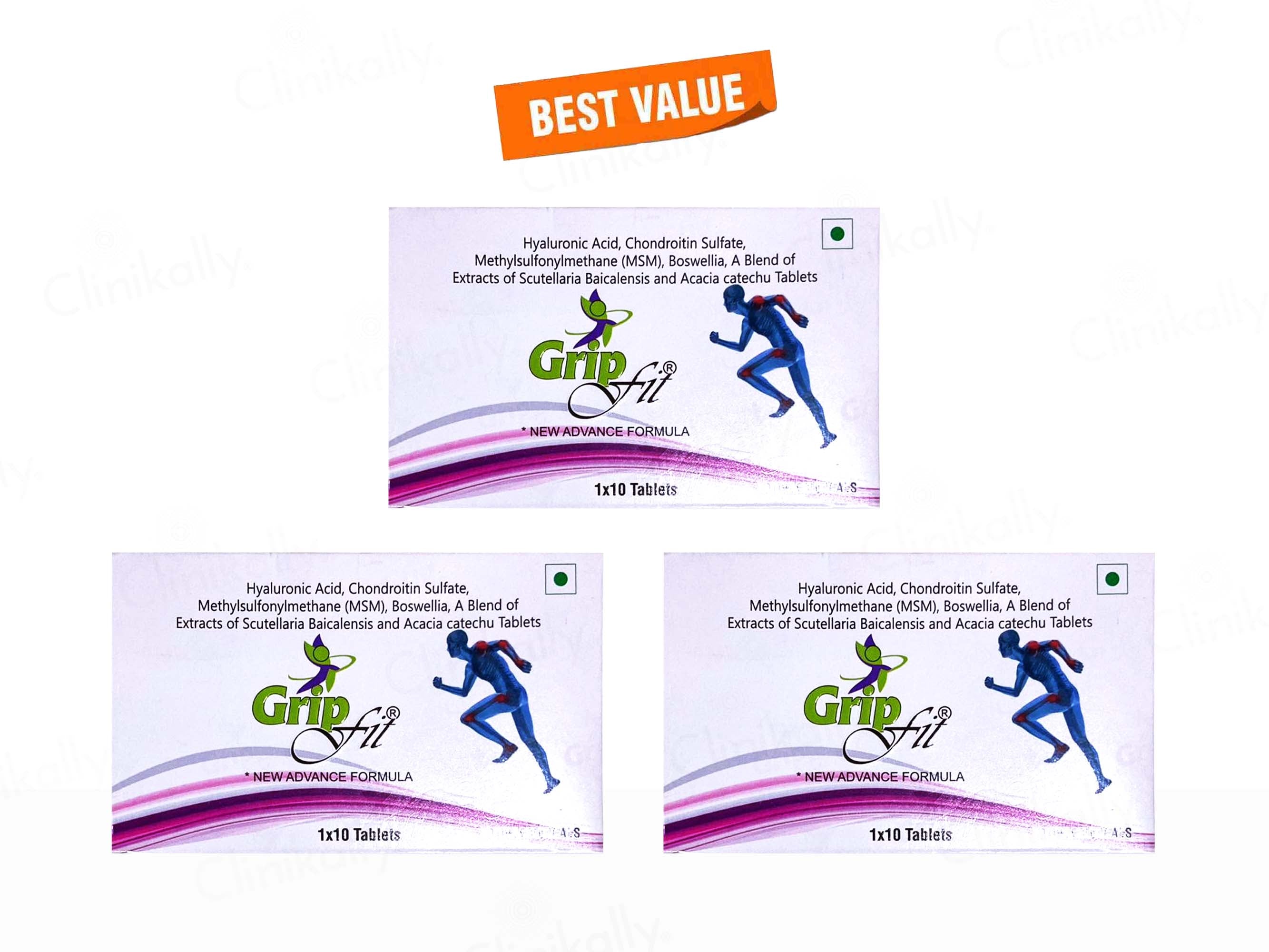 Grip Fit Nutraceutical Tablet is a dietary supplement designed to support joint health by providing essential nutrients like Hyaluronic Acid, Chondroitin, MSM, and Boswellia, helping to maintain joint flexibility and reduce discomfort.