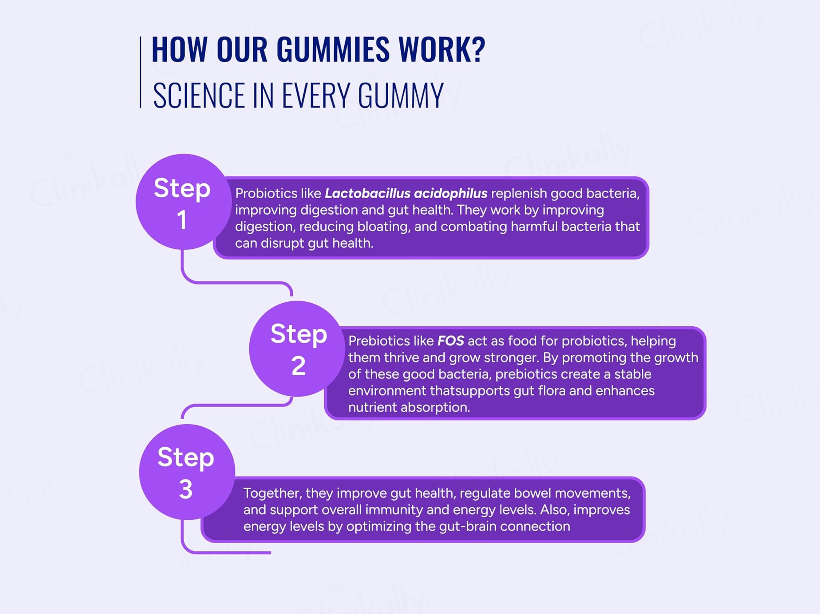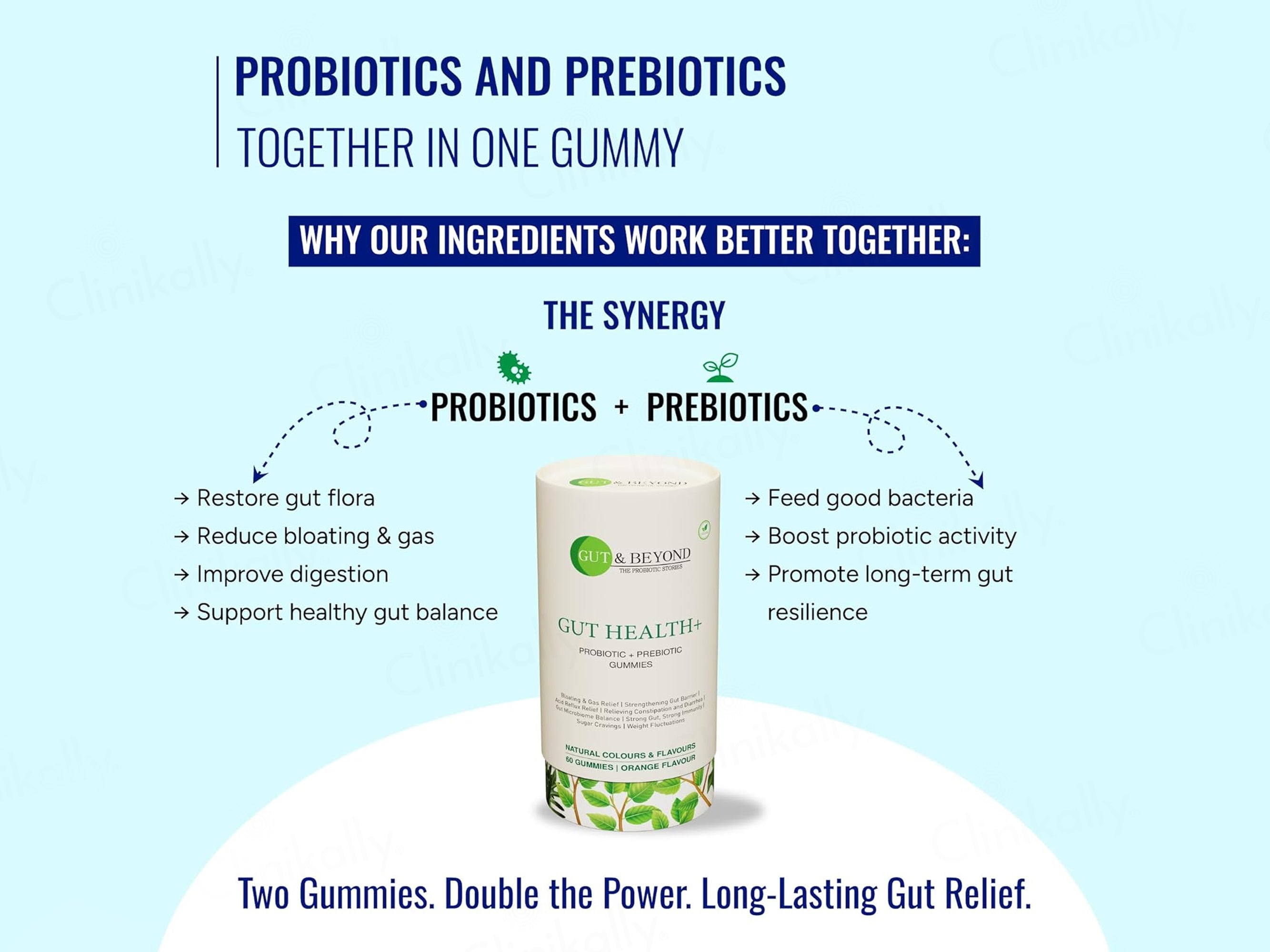 Gut & Beyond Gut Health+ Probiotic + Prebiotic Gummies - Orange Flavour is a vegan dietary supplement in gummy form, designed to support digestive health and immunity. These gummies combine probiotics like Lactobacillus acidophilus and Lactobacillus rhamnosus with prebiotic Fructo-oligosaccharides to promote gut microbiome balance, relieve bloating, gas, acid reflux, and constipation, and reduce sugar cravings. With natural colours and orange flavour, each serving (2 gummies) supports a healthy gut and strong immunity.