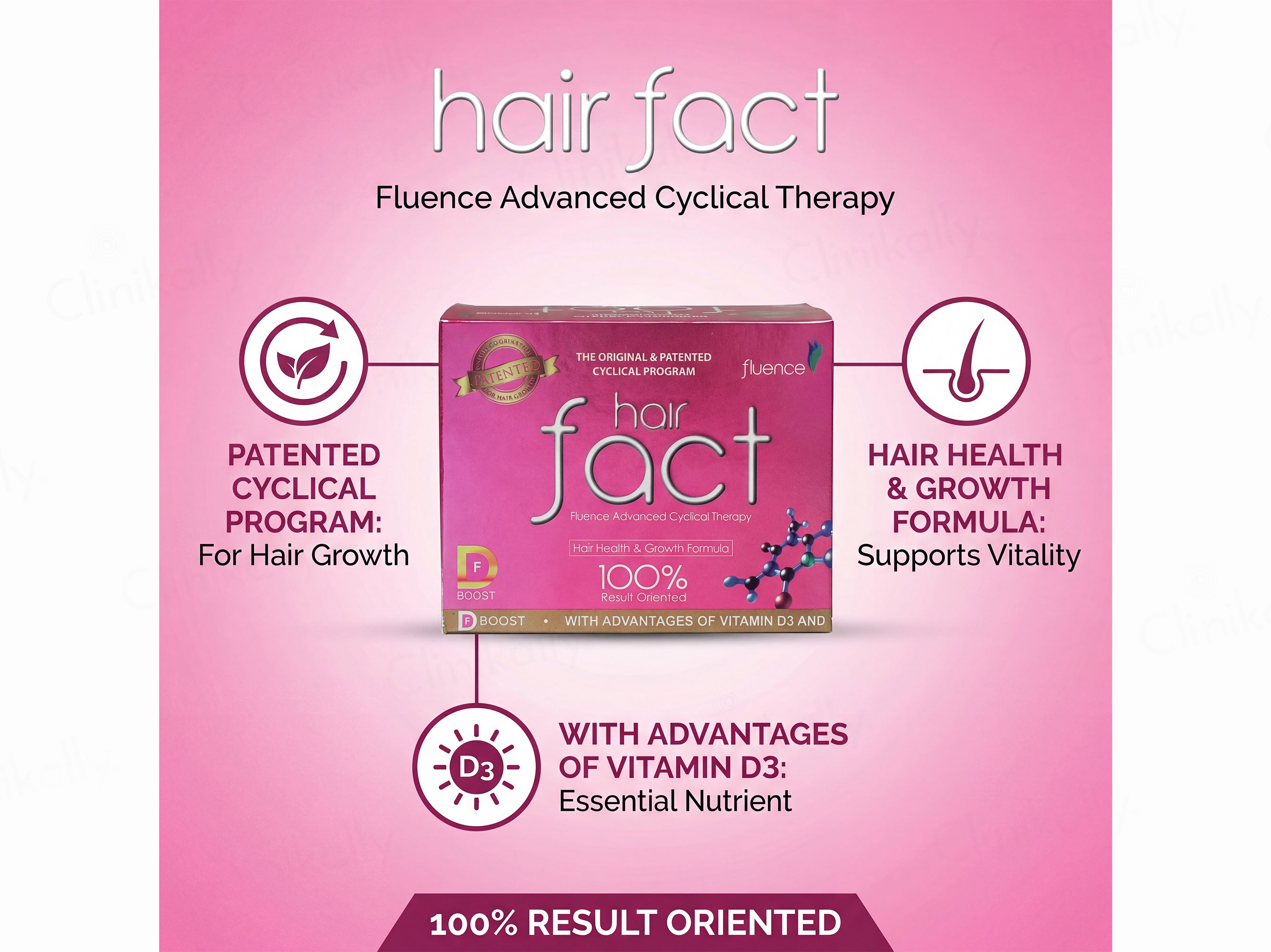 Hair Fact Fluence Advance Cyclical Therapy F Boost is an original, patented cyclical hair growth program created to support stronger roots, thicker-looking hair and hair fall control. This 100% result-oriented hair health & growth formula blends focused supplements-supplying amino acids, iron, bioflavonoids, calcium and key vitamins, with the advantages of Vitamin D3 and B12 support. For men and women, these hair vitamins capsules deliver daily hair nutrition for shine and strength.