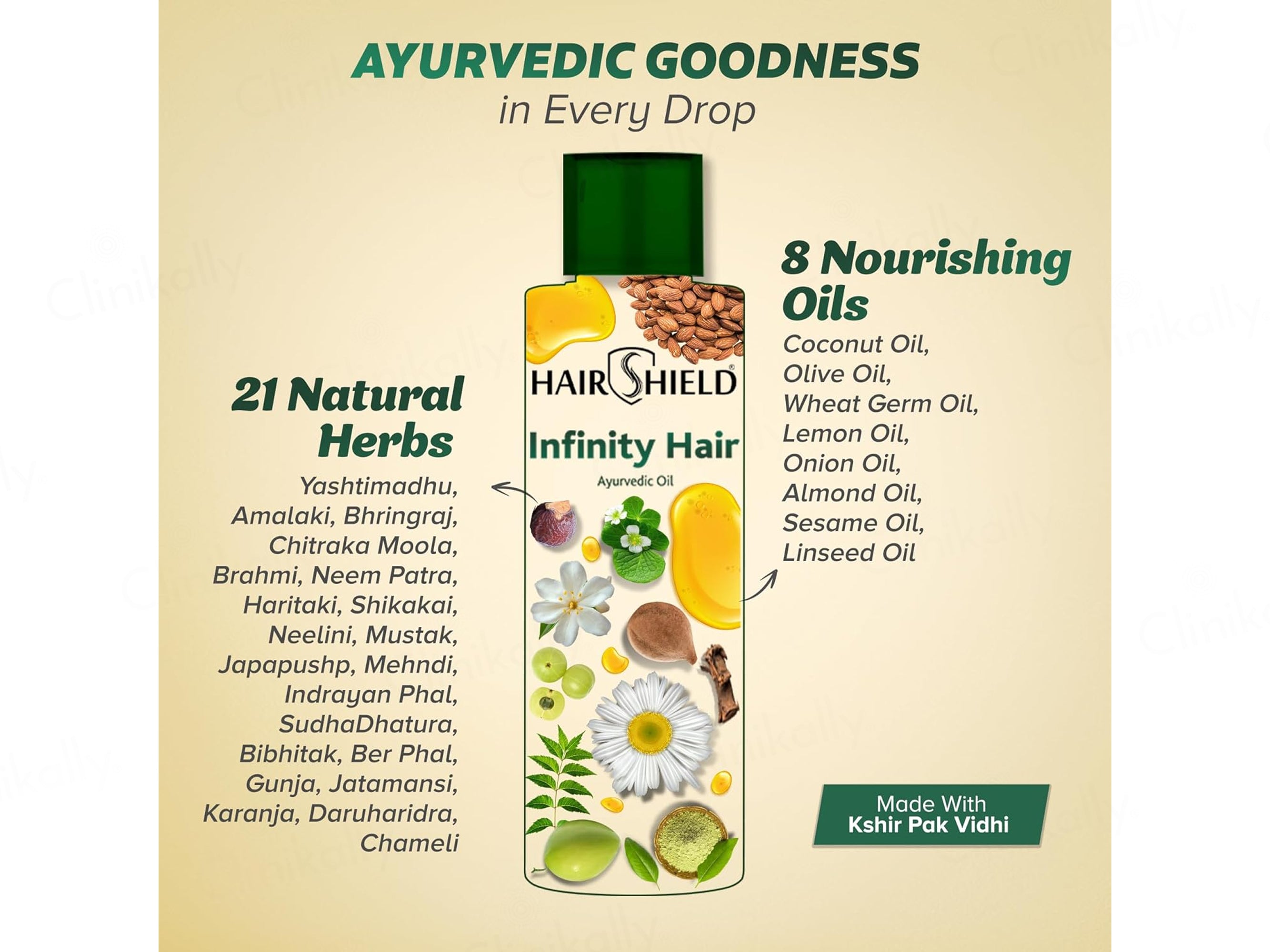 Hairshield Infinity Hair Ayurvedic Oil is a potent, traditional Ayurvedic hair oil crafted with 21 powerful herbs and enriched with natural oils using the ancient Kshir Pak Vidhi process, designed to deeply nourish the scalp from root to tip, promote natural hair growth, significantly reduce hair fall, control dandruff, strengthen roots, minimize breakage and split ends, enhance hair thickness, restore natural shine and blackness, and combat issues like dryness and frizz for healthier, revitalized hair suitable for all types. Key herbal extracts include Bhringraj (Eclipta alba) for stimulating follicles and promoting growth, Amla (Emblica officinalis) for antioxidant-rich nourishment and strengthening, Neem (Azadirachta indica) for antifungal and scalp-soothing benefits to fight dandruff and infections, Brahmi (Bacopa monnieri) for calming the scalp and improving hair health, Neeli (Indigofera tinctoria) for natural darkening and conditioning, Shikakai (Acacia concinna) for gentle cleansing and volume, Mehndi (Lawsonia inermis) for strengthening and shine, Japapushpa (Hibiscus rosa-sinensis) for growth support, along with other supportive herbs like Sudha Dhatura, Gunja, Jatamansi, Yashtimadhu, Chameli, Chitrak, Daruharidra, Haritaki, Bibhitaki, Mustak, Karanji, Ber Phal, and Indrayan for comprehensive scalp revitalization and hair rejuvenation. This non-greasy, herbal formula is ideal for daily or regular use to achieve stronger, thicker, and lustrous hair when massaged consistently.