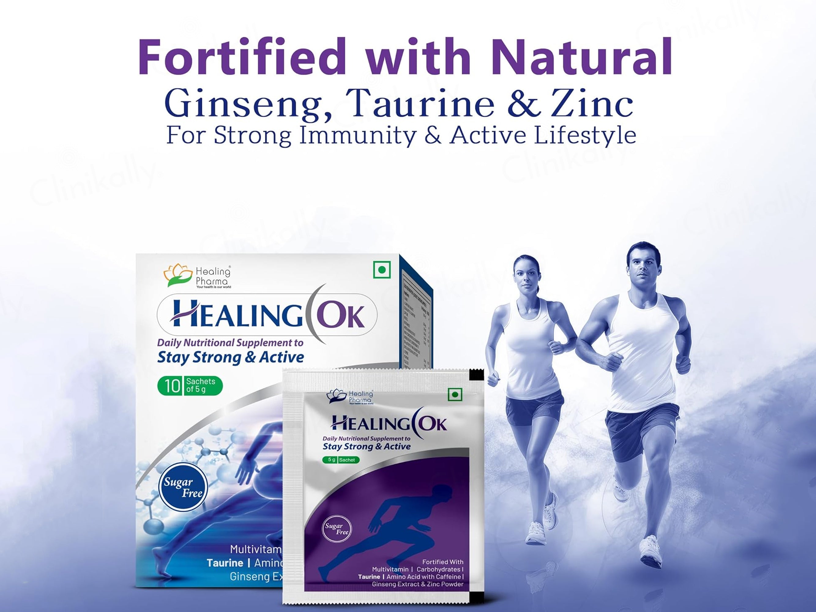 Healing Ok Daily Nutritional Supplement Sugar Free Powder by Healing Pharma is a health-boosting formula designed to keep you strong, energized, and active with a balanced mix of vitamins, minerals, amino acids, and herbal extracts. Fortified with key actives like Taurine, L-Carnitine Fumarate, Caffeine, Inositol, Nicotinamide, American Ginseng Extract, Lycopene, Zinc Sulphate, Vitamin B6, Folic Acid, and Cyanocobalamin, it supports stamina, improves focus, reduces fatigue, and enhances overall vitality. The unique combination of energy boosters and antioxidants makes it ideal for daily use, especially for active individuals, helping to maintain physical endurance and mental alertness when consumed regularly as directed.