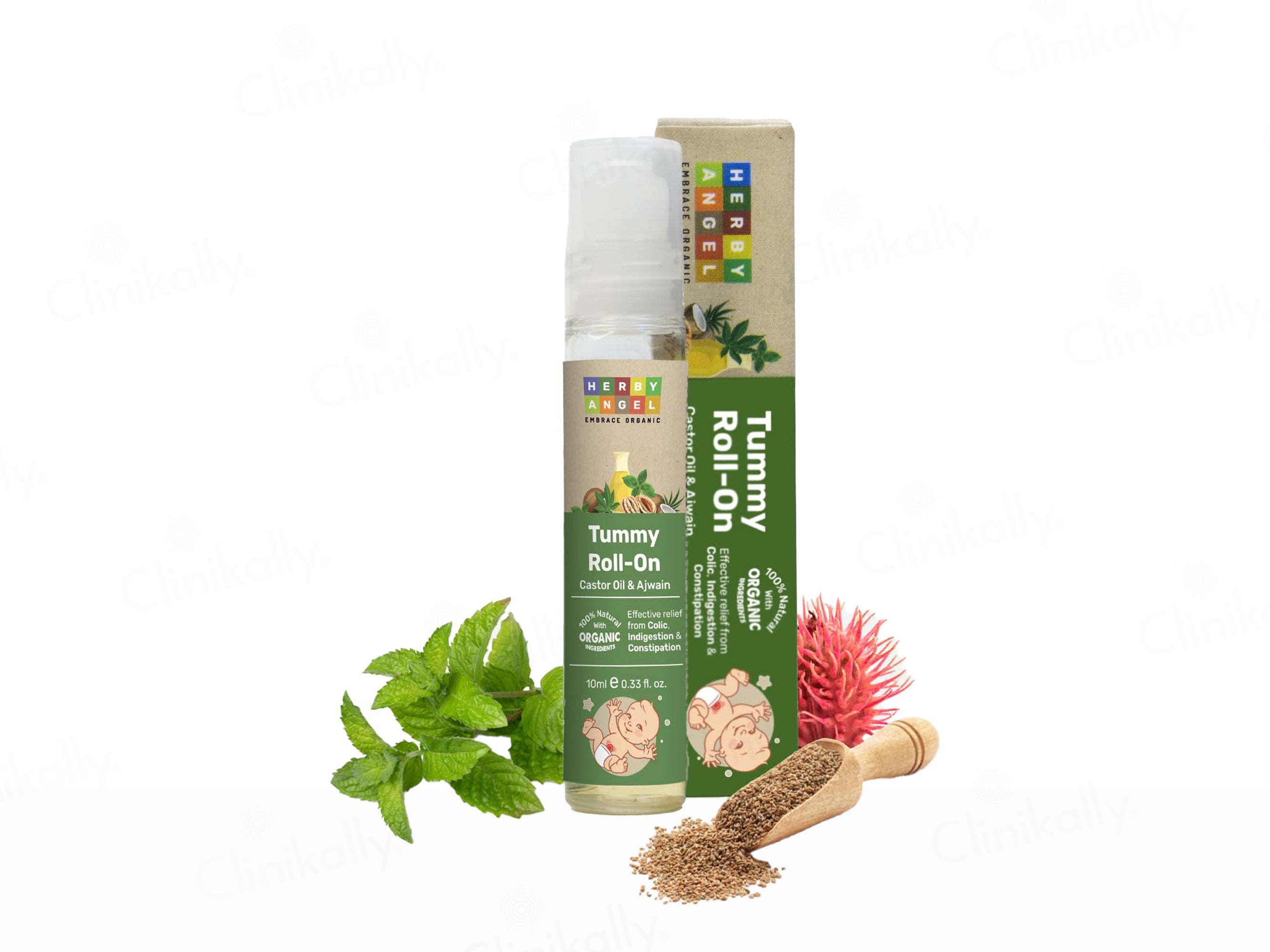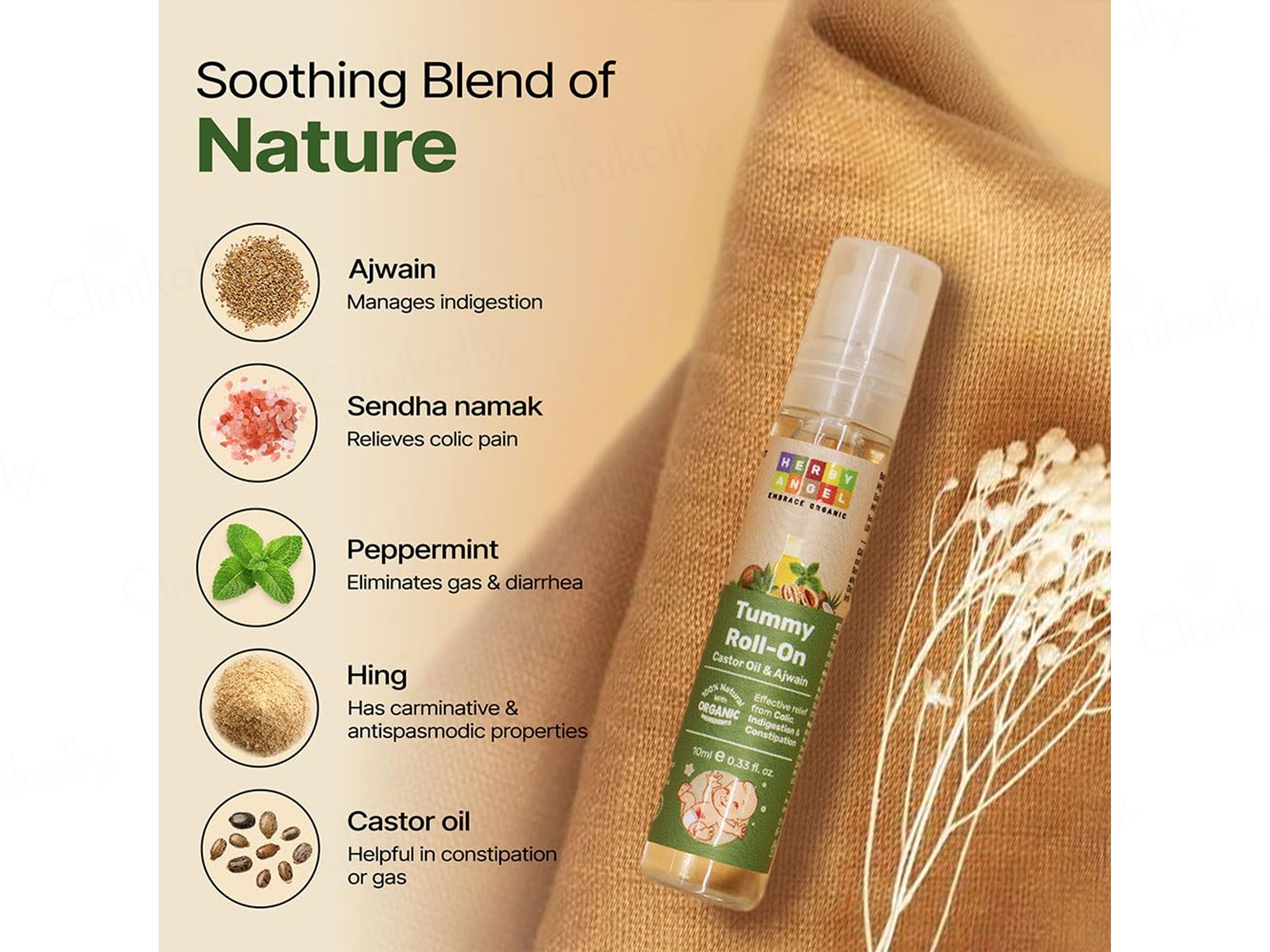 Herby Angel Baby Tummy Roll-On for Babies is a 100% natural Ayurvedic remedy crafted to provide instant relief from colic, gas, indigestion, and constipation in infants. Formulated with key organic ingredients like Castor Oil, Ajwain, Hing, Peppermint, and Sendha Namak, it helps soothe tummy discomfort, reduce bloating, and promote healthy digestion. Castor Oil acts as a natural carrier that nourishes the skin while delivering the goodness of herbs, Ajwain and Hing relieve trapped gas and cramps, Peppermint provides a cooling and calming effect, and Sendha Namak aids gentle digestion. Free from alcohol, DEET, parabens, silicones, and sulphates, this dermatologically tested, cruelty-free roll-on is safe for daily use on sensitive baby skin. Its easy-to-apply, non-sticky formula ensures quick absorption and comfort, helping your baby sleep peacefully without tummy troubles.