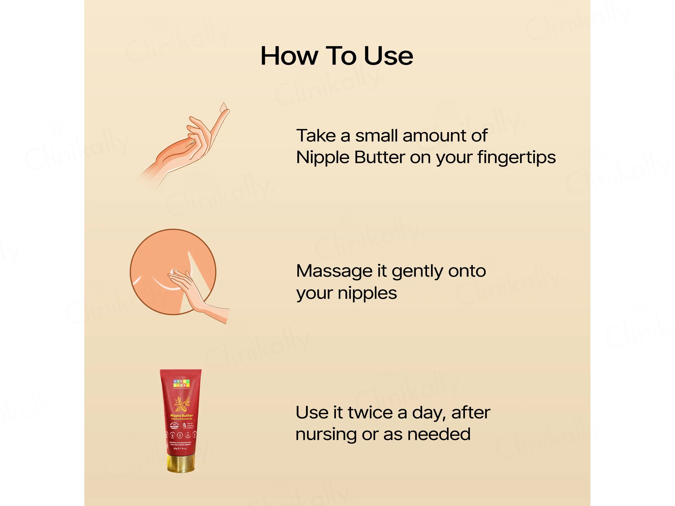 - Apply on nipples two to three times daily or as needed; wipe gently with a soft cloth before breastfeeding.