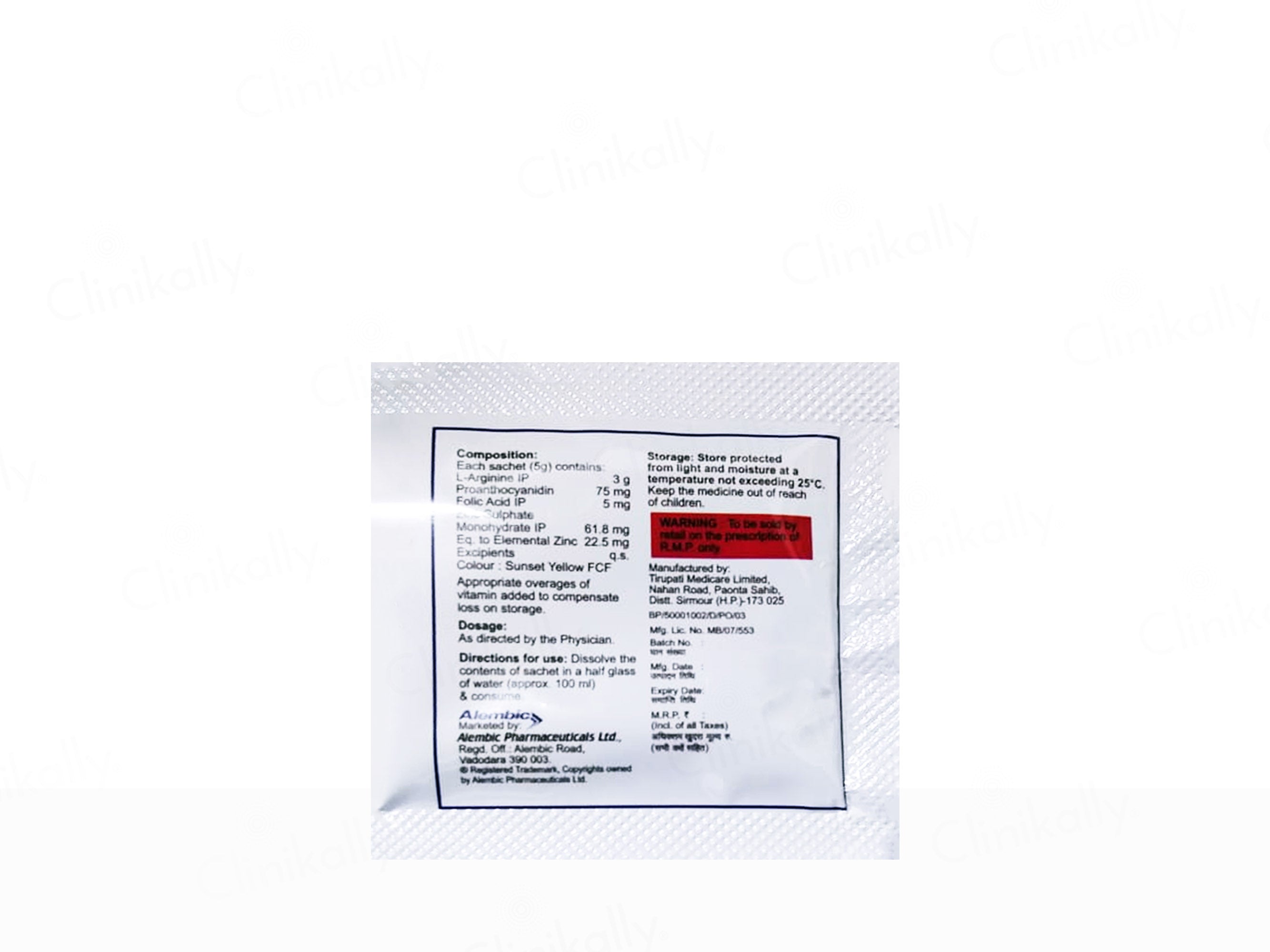 It contains L-Arginine, Proanthocyanidin, Folic Acid, and Zinc Sulphate Monohydrate (Eq. to Elemental Zinc 22.5 mg).