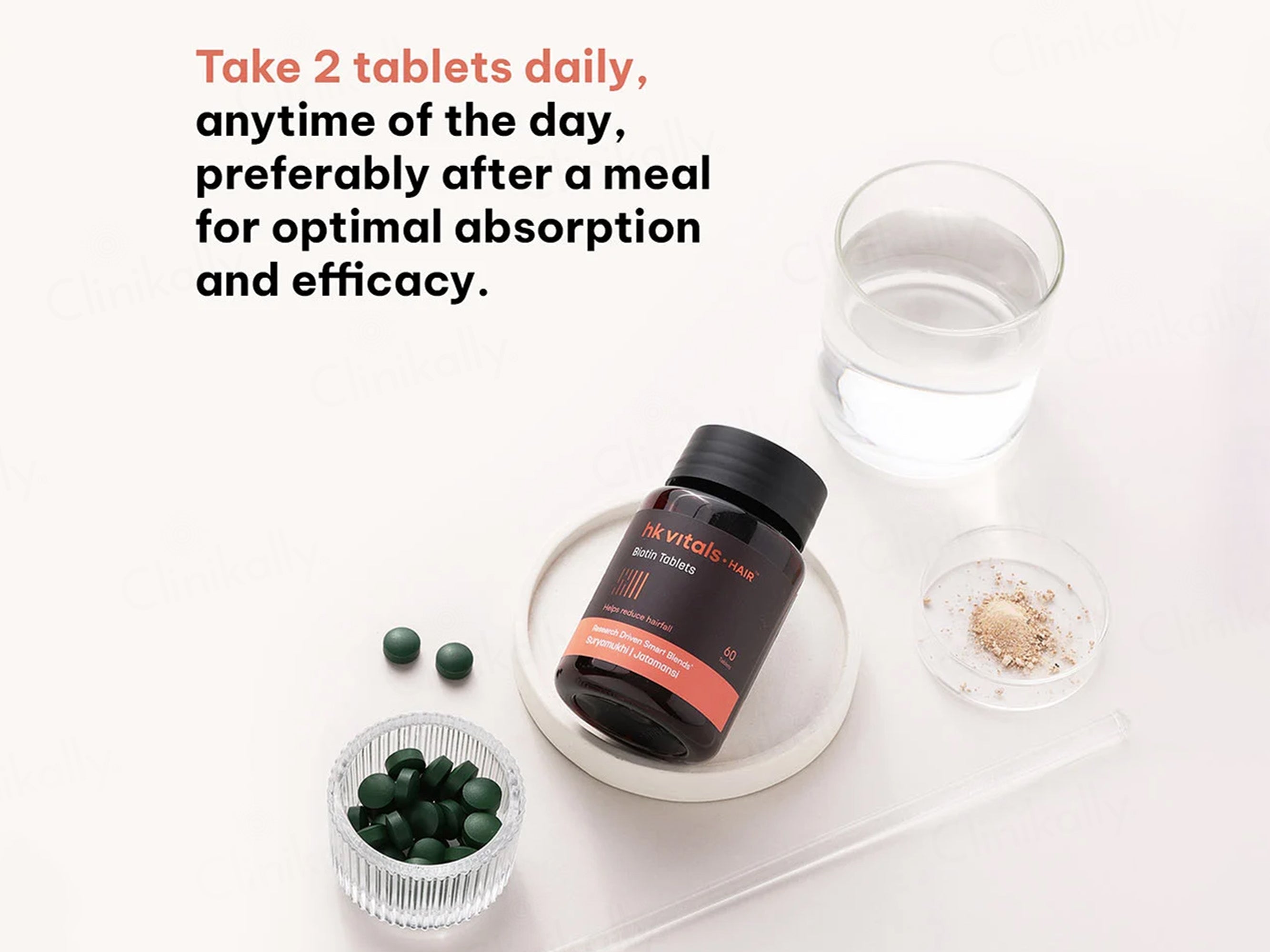 - Take one HK Vitals Biotin Anti-Hairfall Supplement Tablet daily after a meal with water or as directed by a healthcare professional. For best results, use consistently for at least 90 days.