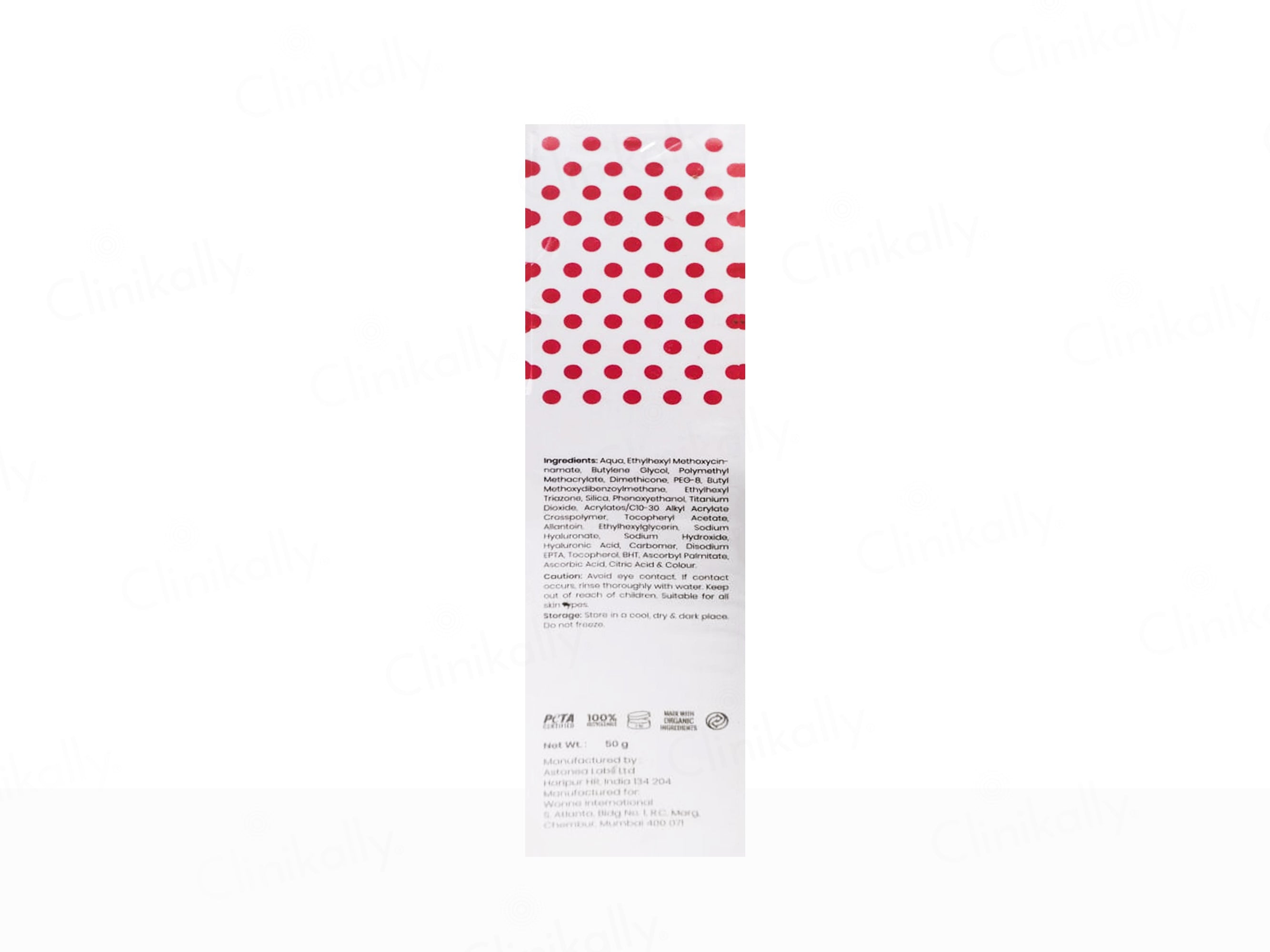 Key ingredients include Hyaluronic Acid, Ethylhexyl Methoxycinnamate, Titanium Dioxide, Allantoin, and Tocopheryl Acetate.