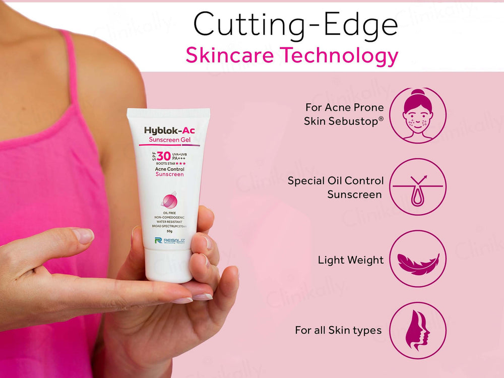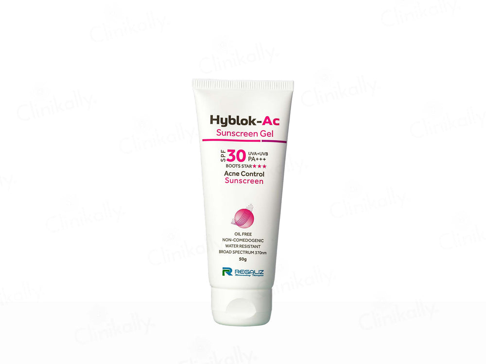 Hyblok-AC Acne Control Sunscreen Gel SPF 30 PA+++ is a lightweight, non-greasy sunscreen formulated to protect the skin from harmful UVA and UVB rays while controlling excess sebum production, making it suitable for acne-prone skin.