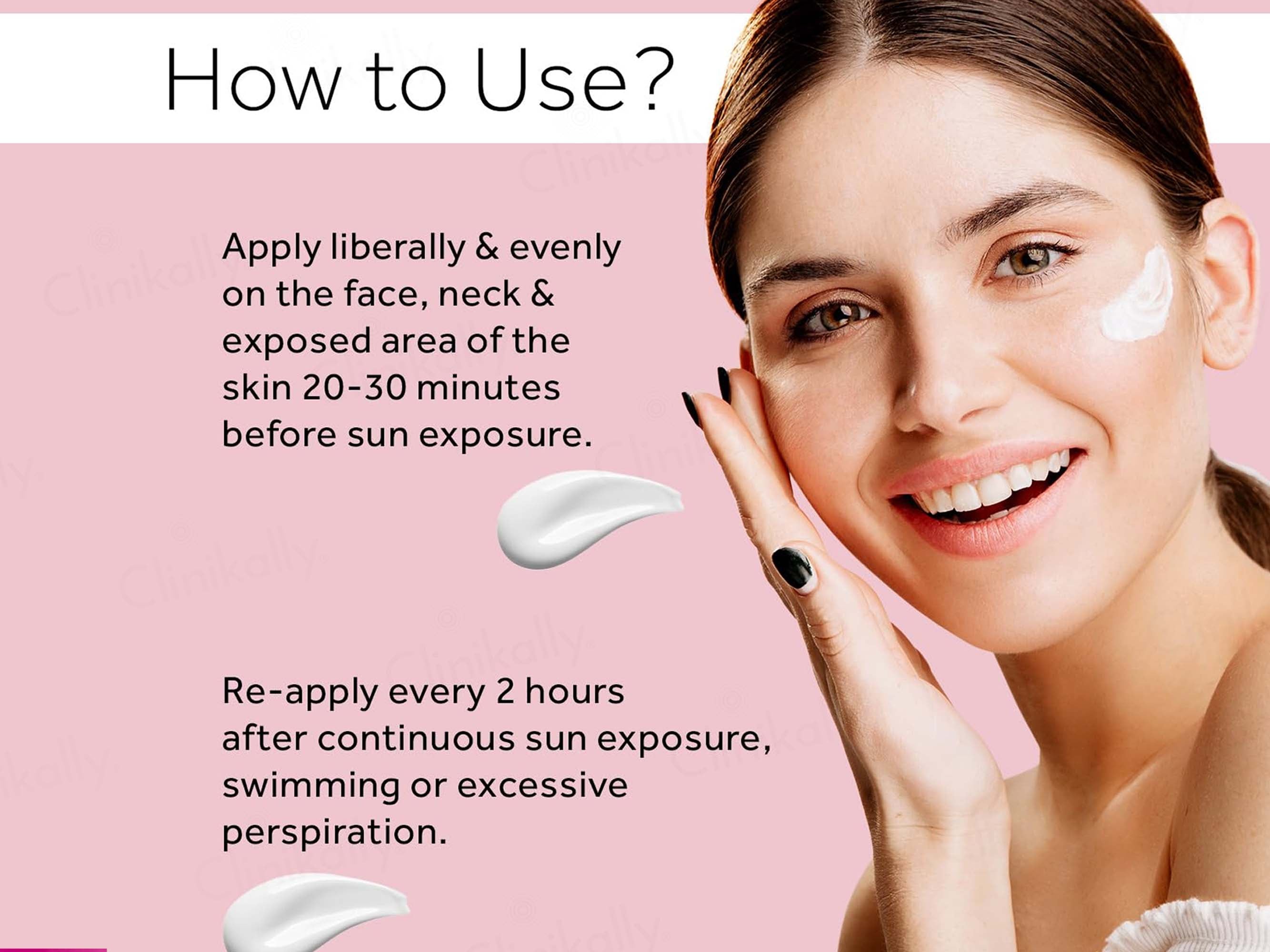 Apply a generous amount on the face, neck, and other sun-exposed areas 20–30 minutes before sun exposure. Reapply every 2 hours or after swimming.
