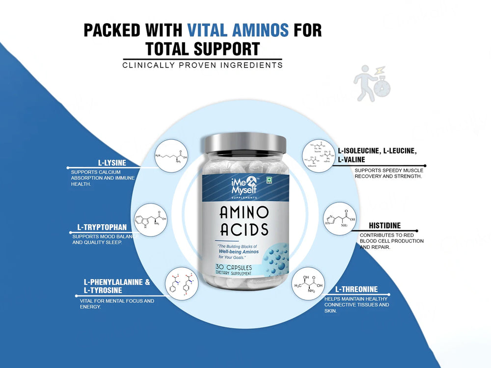 iMeMyself Amino Acids provides a targeted blend of essential amino acids in vegetarian capsules. This premium formula combines L-Isoleucine, L-Leucine, L-Tryptophan, and L-Phenylalanine to support muscle recovery, mental focus, mood balance, and quality sleep. Ideal for athletes and active individuals.