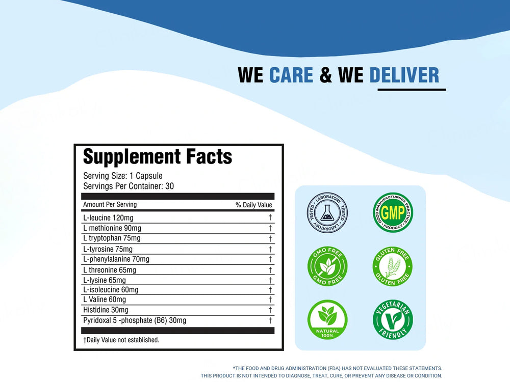 It contains L-Isoleucine, L-Leucine, L-Tryptophan, and L-Phenylalanine for comprehensive support.