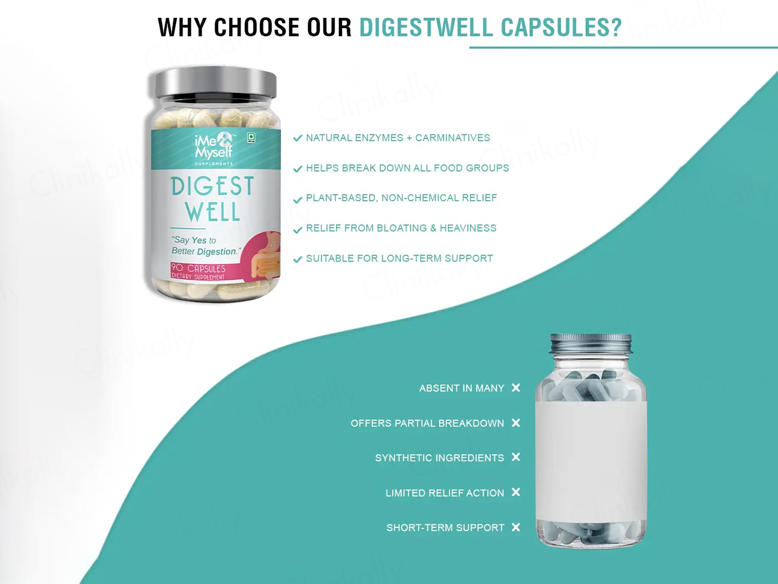 iMeMyself Digest Well Dietary Supplement Vegetarian Capsule is expertly formulated to support healthy digestion, nutrient absorption, and gut comfort. Featuring a powerful blend of digestive enzymes like Pancreatin, Amylase, and Protease along with gut-friendly herbs like Ginger, Licorice, and Ajwain, this vegetarian formula helps break down food efficiently, relieves bloating, and improves metabolic health. Enhanced with probiotics including Lactobacillus and Bifidobacterium strains, it balances gut flora and supports long-term digestive wellness. Ideal for individuals facing indigestion, gas, or dietary discomfort.