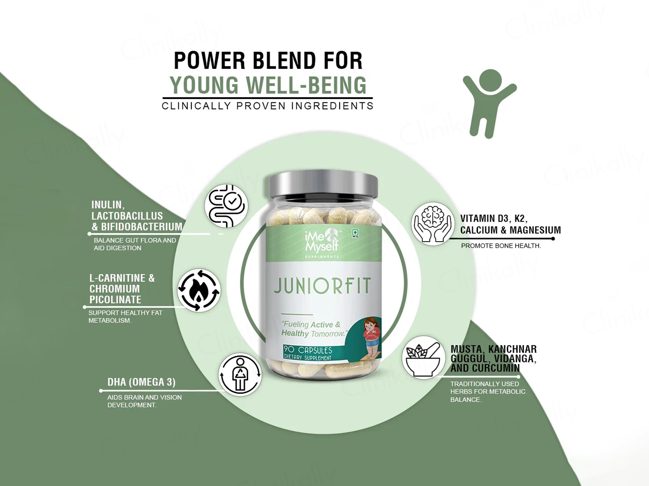 iMeMyself Junior Fit Dietary Supplement Vegetarian Capsule is a comprehensive wellness formula tailored for growing children. It combines potent prebiotics, probiotics, and essential micronutrients to support immunity, energy metabolism, digestion, and cognitive health. Fortified with Omega 3 (DHA), Vitamin B12, Folate, Zinc, and a powerful herbal blend including Amla, Turmeric, and Vidanga, it ensures balanced growth and vitality. With L-carnitine and Chromium Picolinate for metabolic support, this vegetarian capsule is ideal for everyday nutritional reinforcement in active young minds.