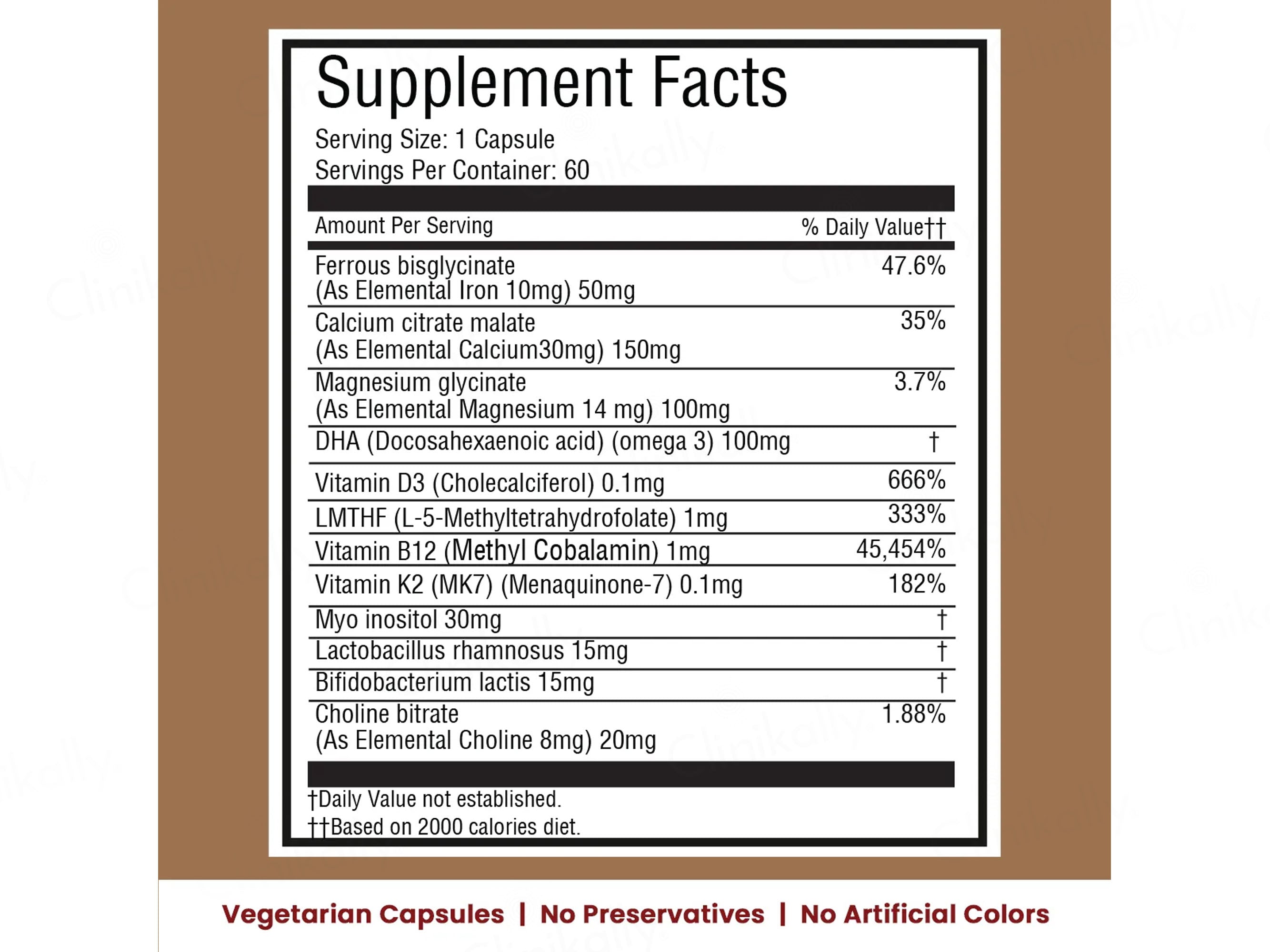 iMeMyself Mom Care Final Nest Dietary Supplement Vegetarian Capsule is a specialized prenatal nutritional formula designed to support maternal comfort, fetal growth, and overall wellness during the late stages of pregnancy, providing essential nutrients to meet increased demands for iron, calcium, magnesium, omega-3 DHA, probiotics, and key vitamins while helping to promote bone health, brain development, gut balance, and energy in the final trimester. It features gentle, bioavailable key actives including Ferrous Bisglycinate (providing 10mg elemental iron) to support healthy blood volume and prevent anemia without common digestive discomfort, Calcium Citrate Malate (providing 30mg elemental calcium) for superior absorption and bone support for both mother and baby, Magnesium Glycinate (providing 14mg elemental magnesium) to aid muscle relaxation, reduce cramps, and support sleep, DHA (100mg omega-3) for fetal brain and eye development, Vitamin D3 to enhance calcium utilization, active L-5-MTHF (folate) and Vitamin B12 (Methylcobalamin) for neural health and red blood cell formation, Vitamin K2 (MK-7) to direct calcium to bones, Myo-Inositol for metabolic and hormonal balance, Lactobacillus rhamnosus and Bifidobacterium lactis probiotics to support gut health and immunity, along with Choline Bitartrate (providing 8mg elemental choline) for brain development and placental function.