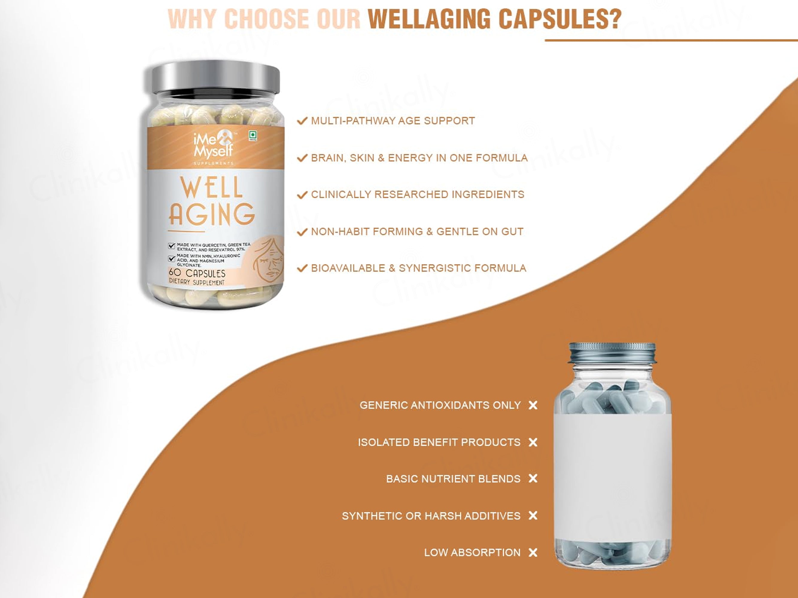 iMeMyself Well Aging Dietary Supplement is a vegetarian capsule formulated to support healthy aging, enhance cognitive function, and maintain cellular vitality with antioxidant-rich ingredients. It promotes joint health, skin elasticity, and energy levels while combating oxidative stress, offering a non-habit-forming option for long-term wellness.