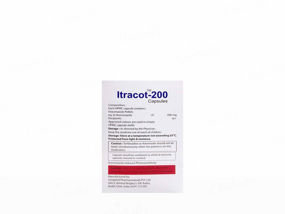 Itracot-200 Capsule contains itraconazole, a broad-spectrum antifungal medication used to treat severe and systemic fungal infections, including those affecting the skin, nails, and internal organs. It works by disrupting fungal cell membranes, effectively stopping their growth and eliminating infections like candidiasis, aspergillosis, and dermatophytosis. Itracot-200 is ideal for managing more persistent or extensive fungal infections under strict medical supervision, providing targeted relief and preventing recurrence when used consistently as prescribed.
