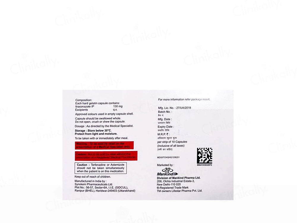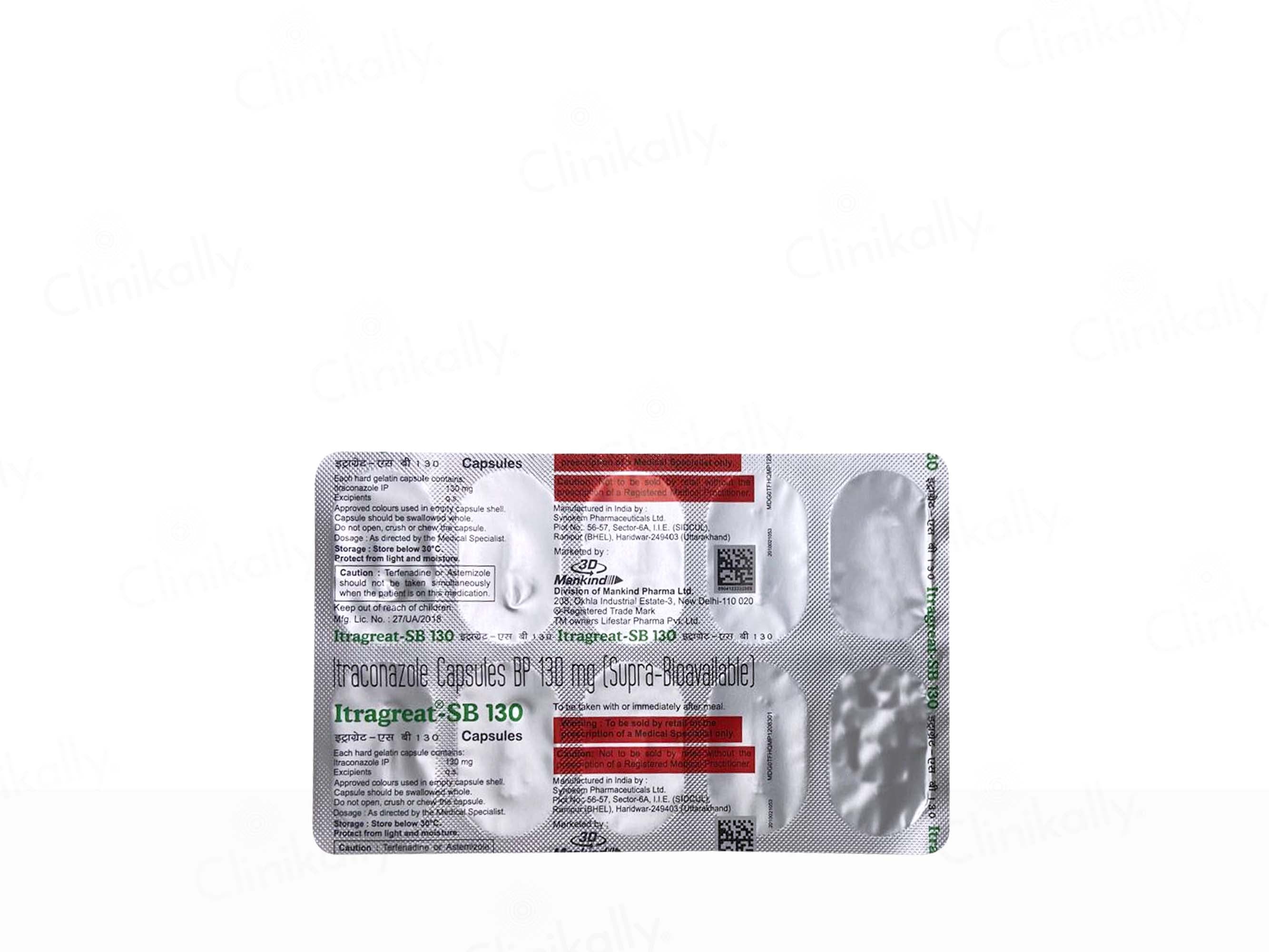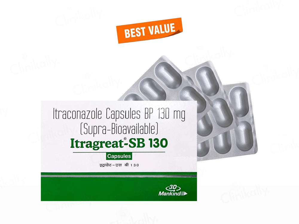 Itragreat SB 130 Capsule is a potent antifungal treatment containing 130mg of supra bioavailable Itraconazole. This formulation enhances the absorption and efficacy of the drug, making it effective against a range of fungal infections. It is commonly prescribed for the treatment of systemic and superficial fungal infections, providing rapid relief with improved bioavailability for better results.
