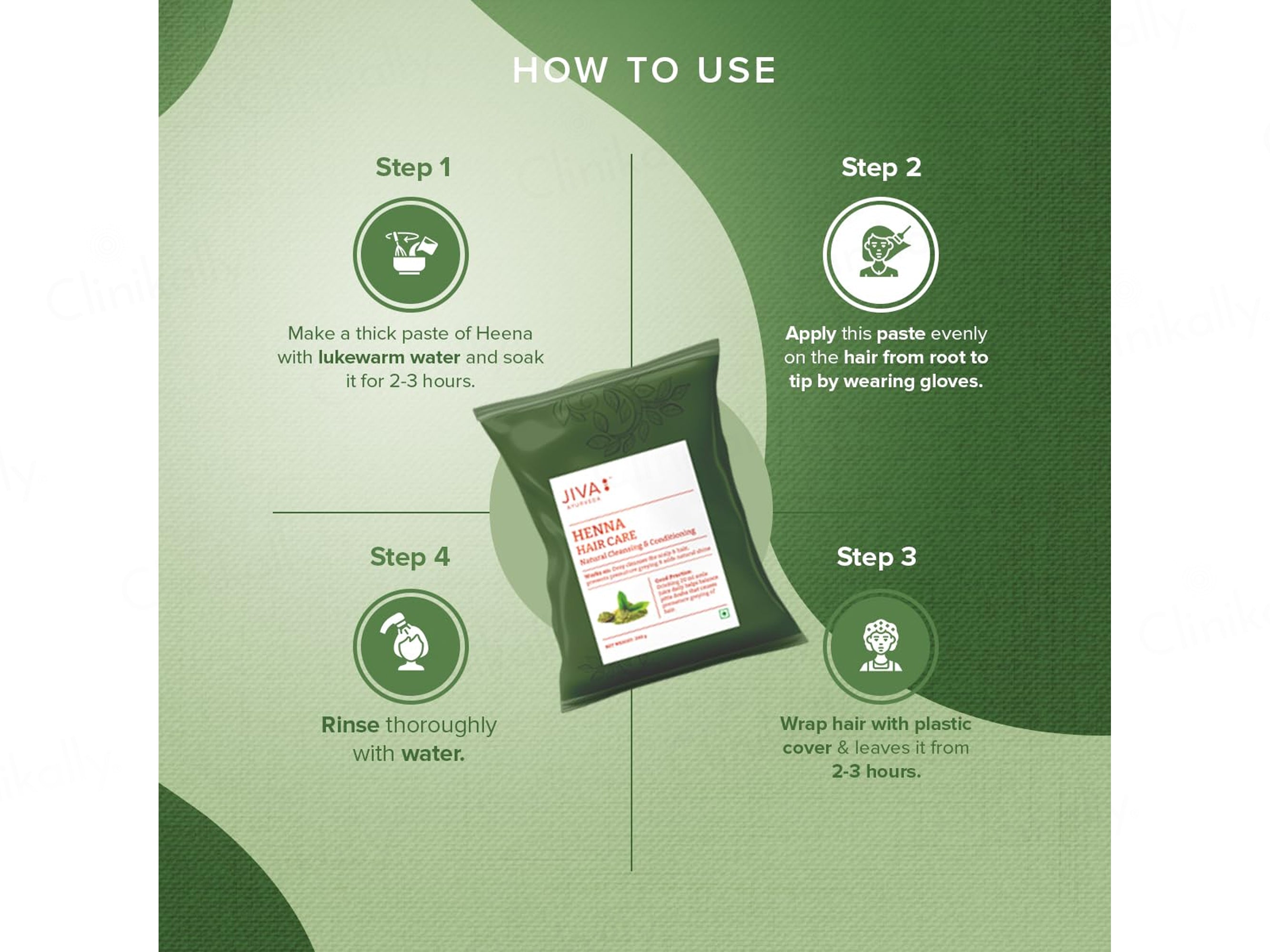 - Apply Jiva Ayurveda Henna Hair Care Powder evenly on the hair from root to tip by wearing gloves, wrap hair with plastic cover and leave it for 2 hours, then rinse thoroughly with water.
