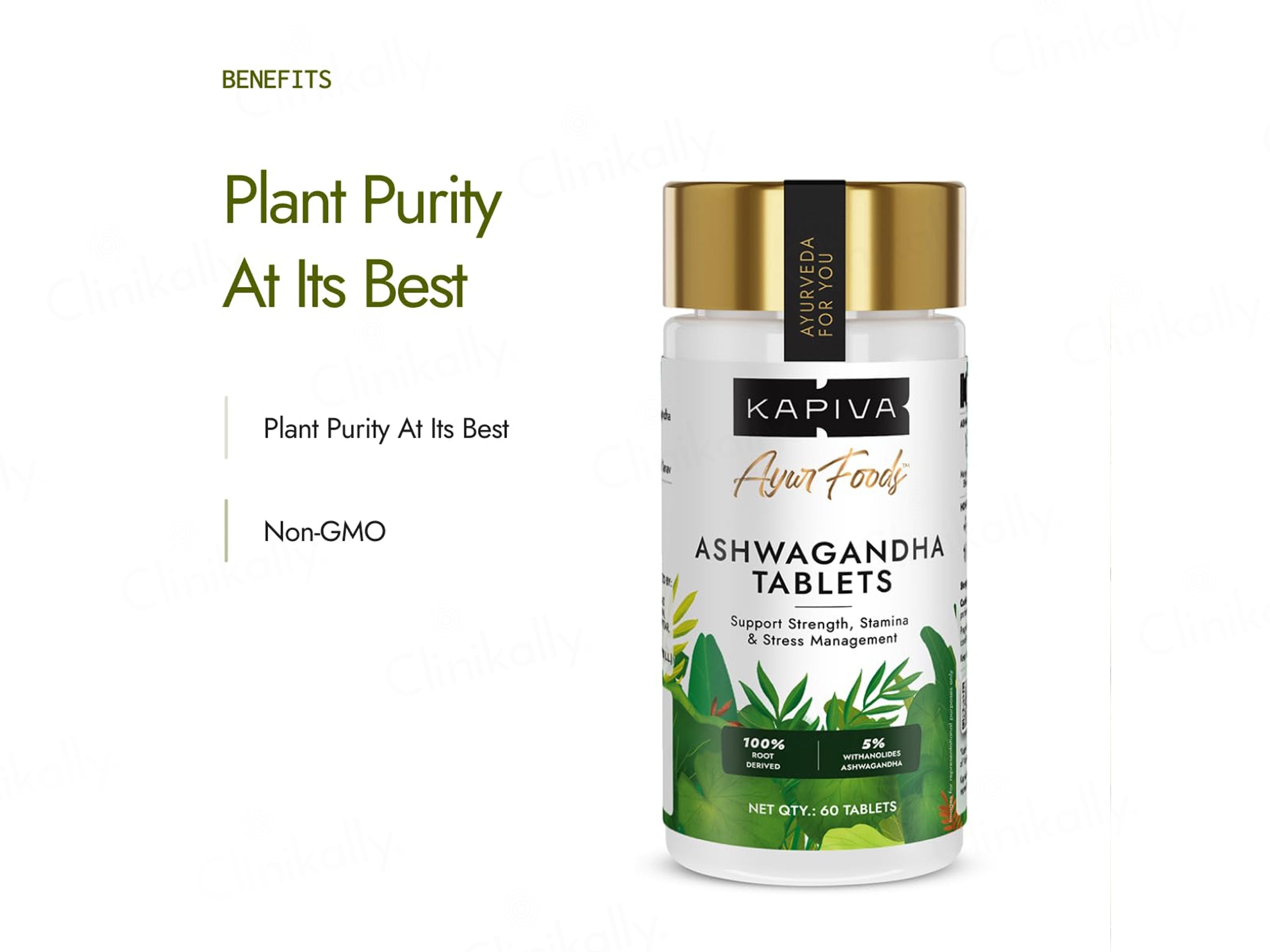 Kapiva Ashwagandha Tablet For Stamina & Stress Management is an Ayurvedic supplement formulated to support strength, stamina, and stress management using traditional herbal goodness, featuring Ashwagandha as its primary ingredient with 5% Withanolides derived from 100% Shuddh herb, designed to help improve overall vitality, enhance physical endurance, and promote mental relaxation when used consistently as part of a daily wellness routine.