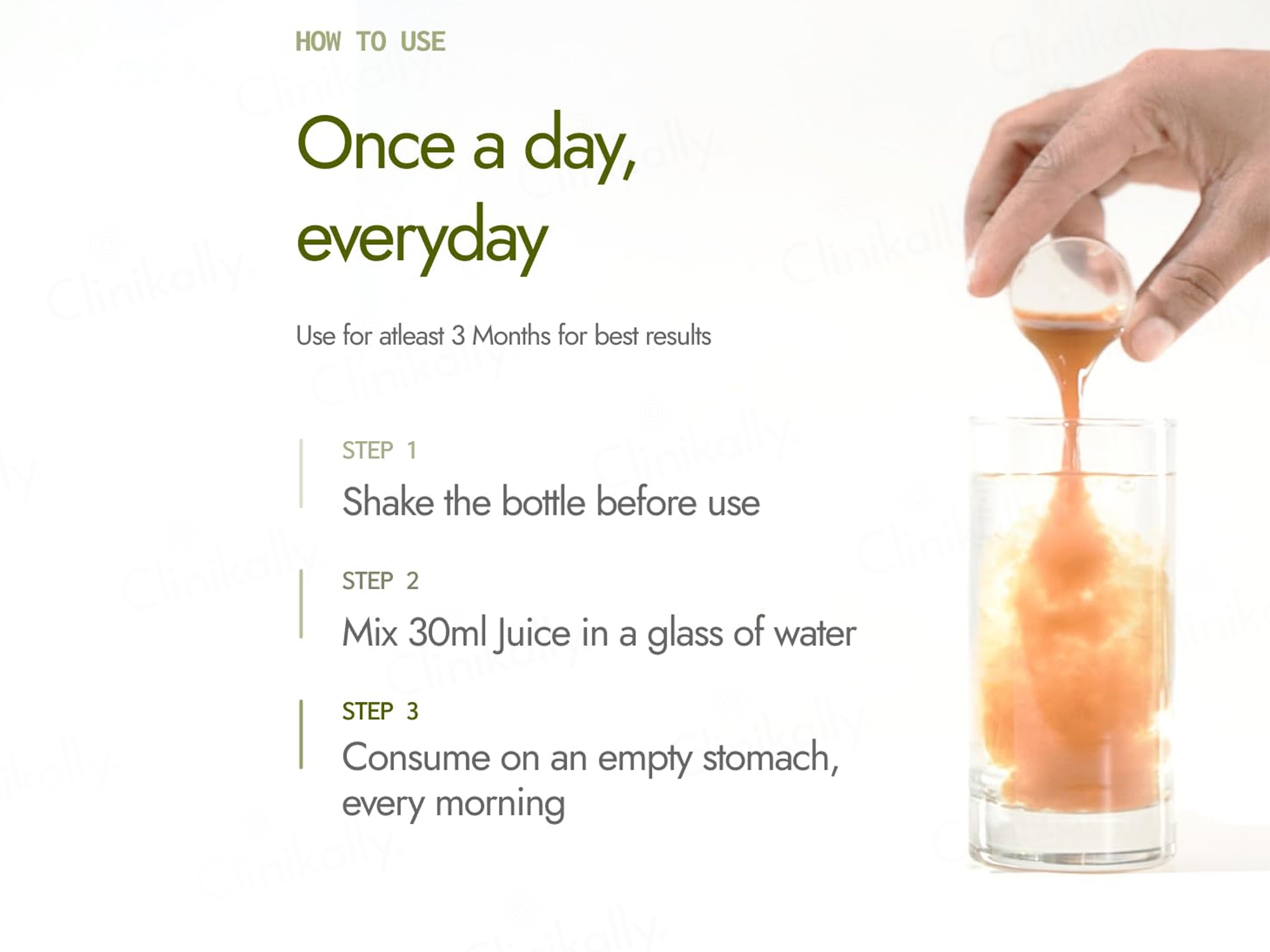 Take 30ml diluted in water every morning, 30 minutes before breakfast for best results.