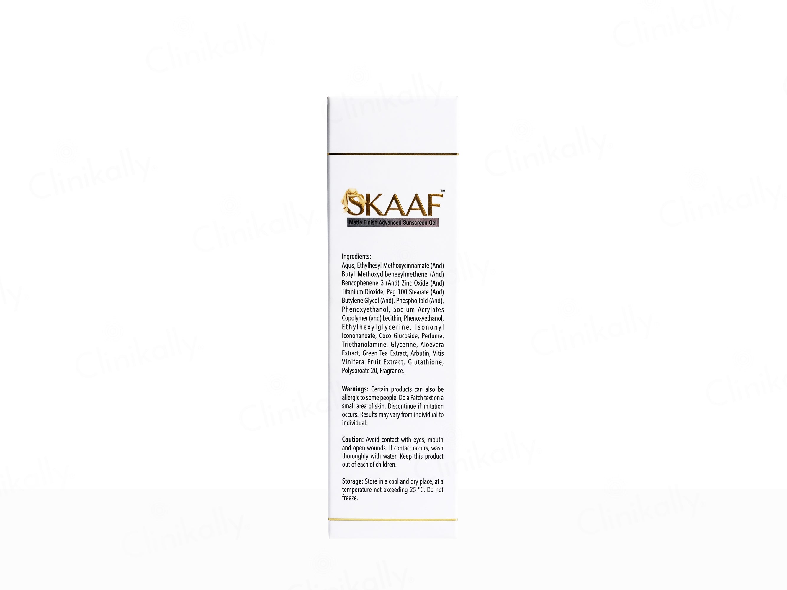 Kemiq Skaaf Matte Finish Advanced Sunscreen Gel SPF 50 PA++++ is a high-protection sunscreen formulated to provide broad-spectrum UVA/UVB/IR defense while delivering a matte finish suitable for daily use, designed to be water and sweat resistant with additional benefits like anti-aging, antioxidant support, and skin brightening while remaining non-comedogenic and alcohol-free for comfortable wear; the formulation features key ingredients such as Zinc Oxide and Glutathione that help protect against harmful sun rays and support skin brightening and defense against environmental damage, making it ideal for maintaining healthy and protected skin under sun exposure.