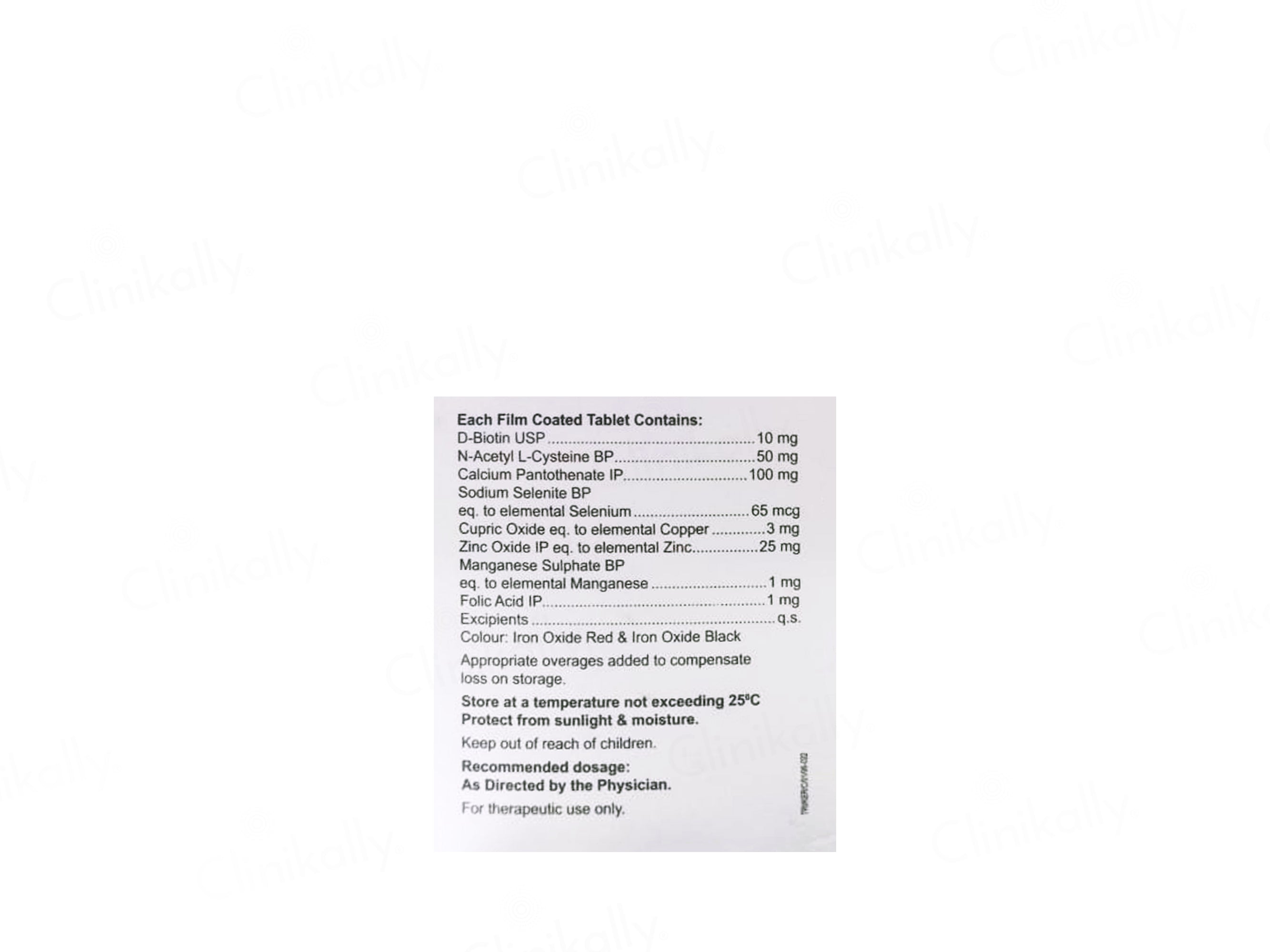Keraboost Tablet contains D-Biotin, Calcium pantothenate, Cupric Acid, Manganese Sulphate, Sodium Selenite, Zinc Oxide, Folic acid, and N-acetylcysteine L-Cysteine.