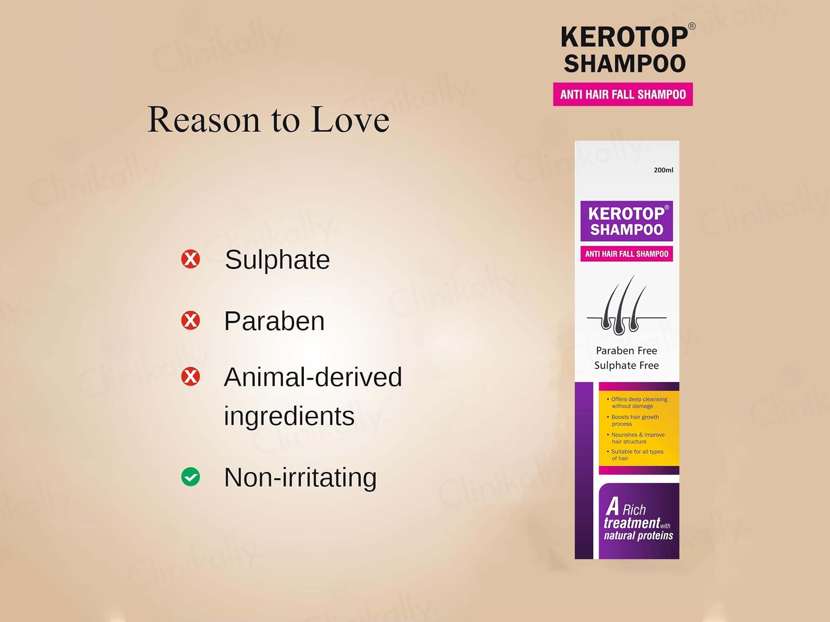 Kerotop Anti Hair Fall Shampoo is a protein-rich formula designed to strengthen hair, reduce breakage, and promote healthier scalp conditions. Enriched with natural proteins, it deeply cleanses without stripping away essential moisture, making it ideal for everyday use. This sulphate-free and paraben-free shampoo boosts the hair growth process, improves hair texture, and nourishes each strand from root to tip. Suitable for all hair types, Kerotop Anti Hair Fall Shampoo offers a safe and gentle solution to thinning hair and breakage issues.