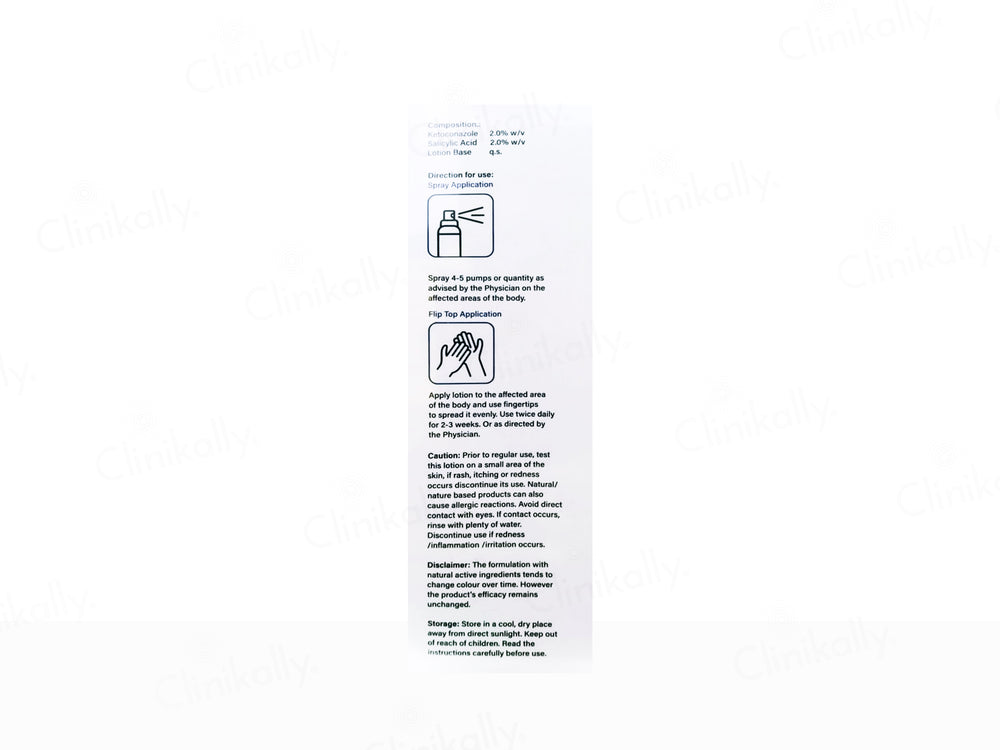 Ketoelite-S Lotion combines the antifungal power of 2% Ketoconazole and the exfoliating properties of 2% Salicylic Acid. This dual-action lotion effectively treats extensive fungal infections like Tinea versicolor and Tinea corporis by targeting fungal growth and removing dead skin cells. The lotion’s unique design allows for spray or flip-top application, ensuring convenience and thorough coverage of affected areas.