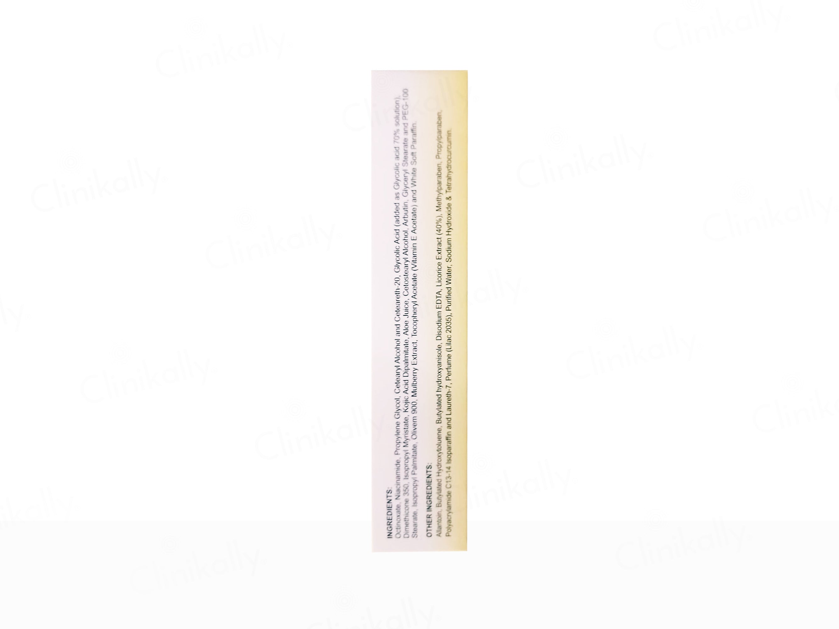 The key ingredients include octinoxate, niacinamide, glycolic acid, kojic acid dipalmitate, arbutin, mulberry extract, vitamin E, and tetrahydrocurcumin.