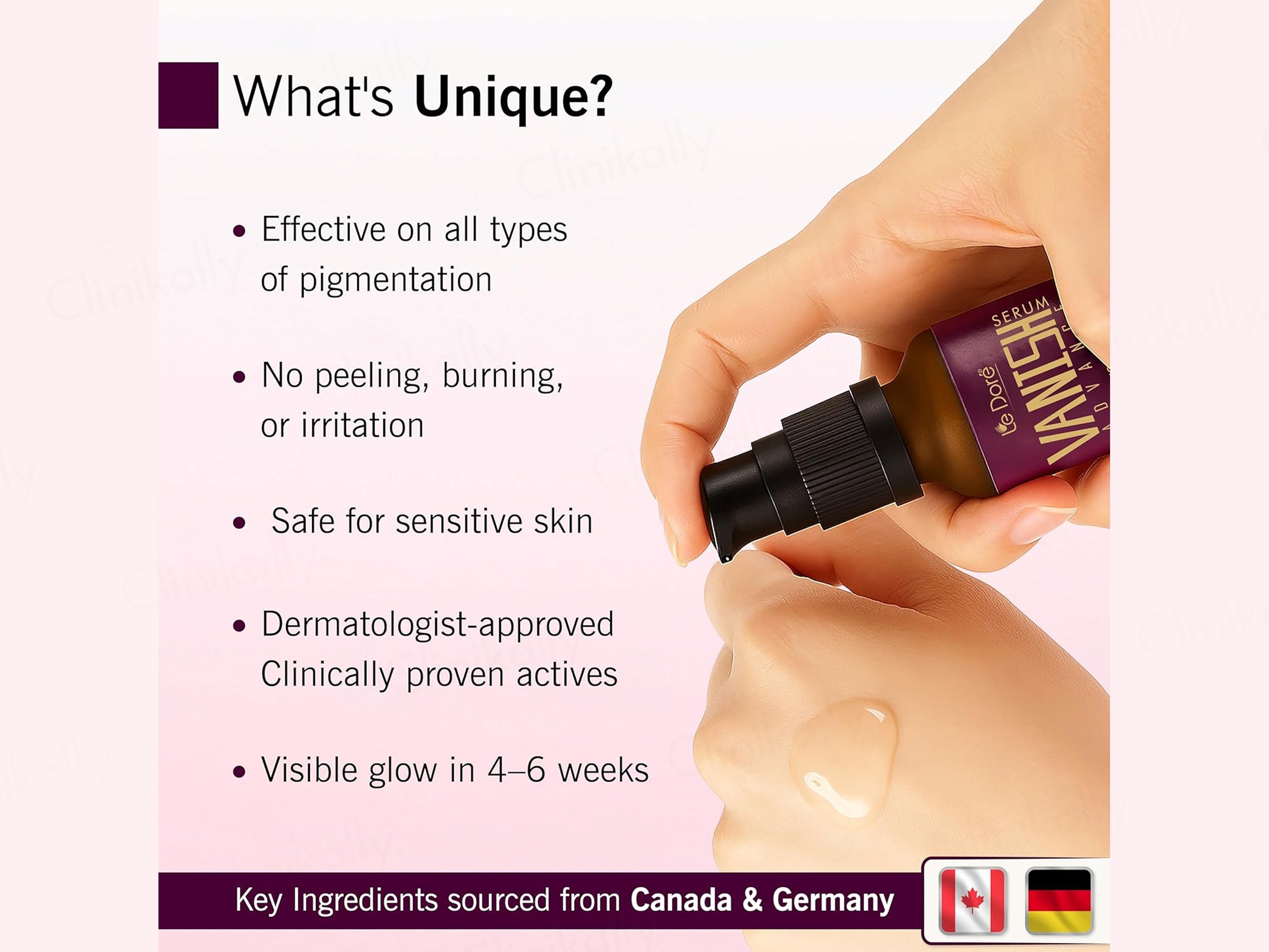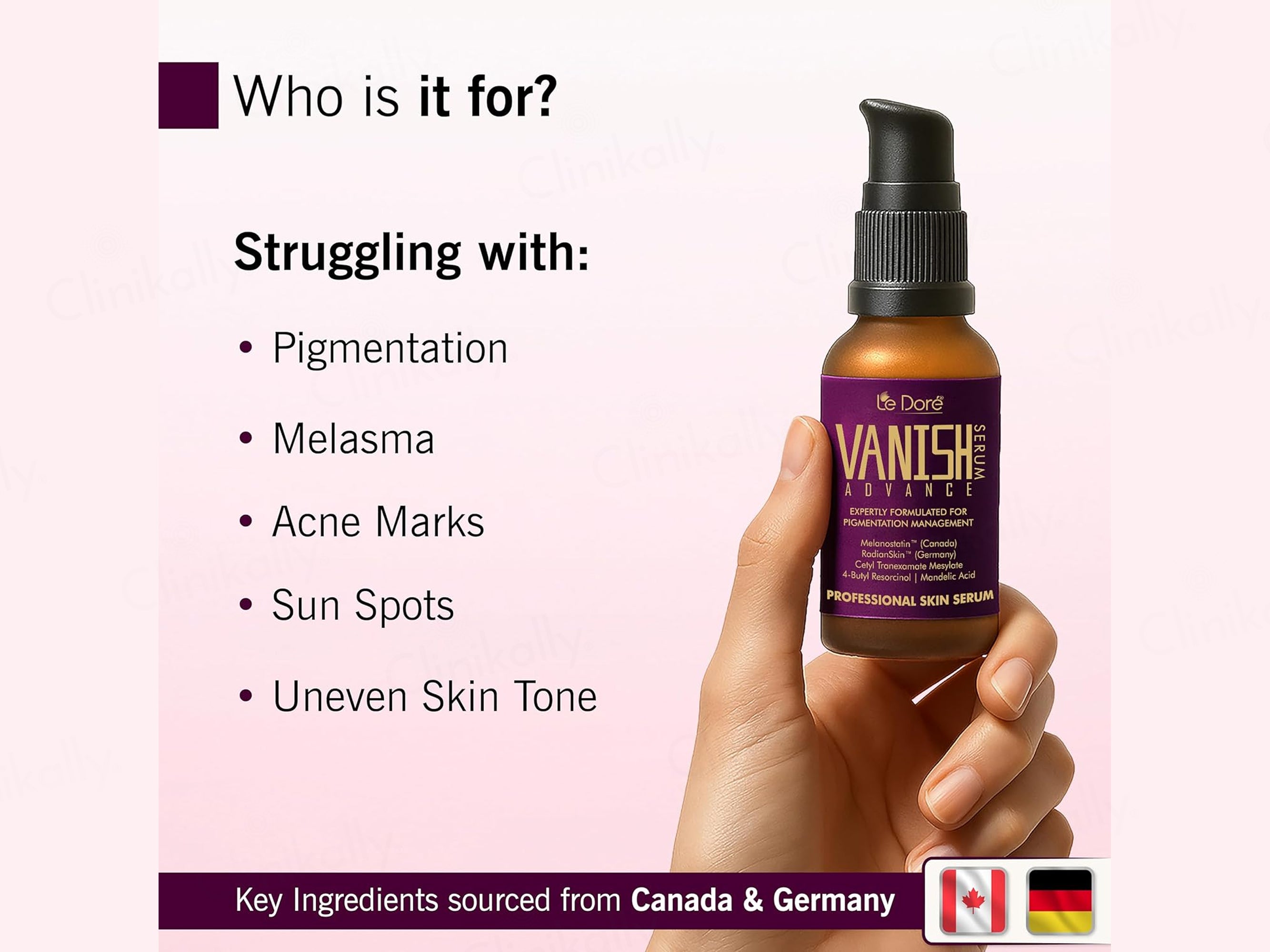 Le Dore Vanish Advanced Pigmentation Serum is a professional, dermatologist-approved skin serum expertly formulated to target melasma, dark spots, and uneven tone for all pigmentation types, delivering visible glow and brighter complexion in 4-6 weeks without peeling, burning, or irritation, safe for sensitive skin with clinically proven actives. Infused with Alpha Arbutin for potent melanin inhibition, Tranexamic Acid for reducing hyperpigmentation, Niacinamide for soothing and barrier repair, 4-n-Butylresorcinol for fading stubborn spots, and natural extracts like Citrus Aurantium Dulcis Peel Extract, Laurus Nobilis Leaf Extract, and Glutathione for antioxidant protection and even-toned radiance, this lightweight formula promotes luminous, balanced skin when used consistently on clean face.
