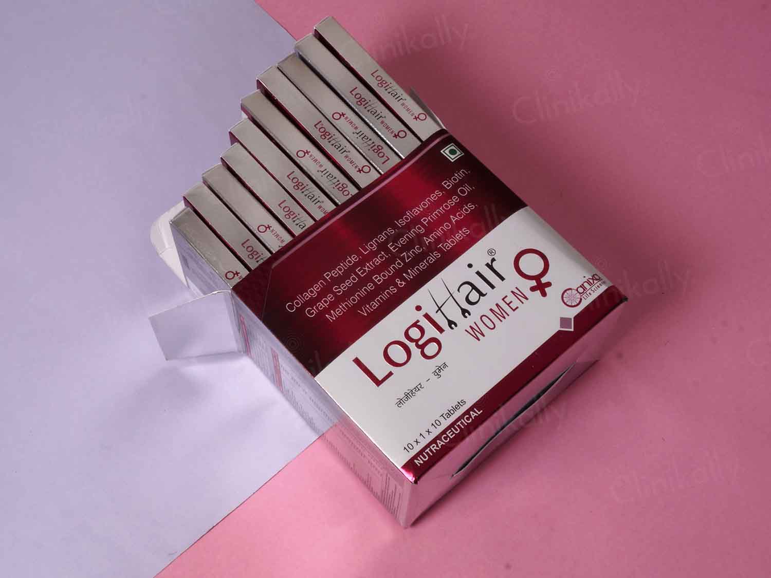 Logihair Women Tablet contains a blend of collagen peptide, biotin, grape seed extract, green tea extract, amino acids, and essential vitamins and minerals.