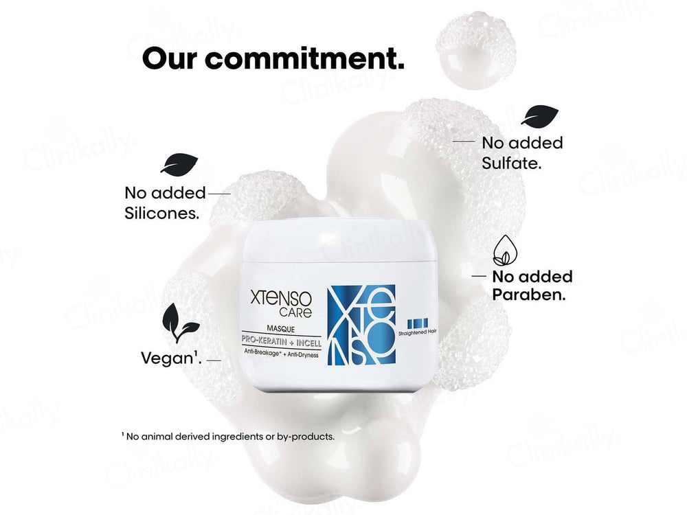 L'Oréal Professionnel Xtenso Care Hair Masque is an intensive treatment designed for chemically straightened or smoothened hair. Enriched with Pro-Keratin and Incell, this masque nourishes and strengthens hair fibers, helping to repair damage caused by chemical treatments. It adds moisture, smoothness, and softness while taming frizz and flyaways. The rich, creamy texture provides deep conditioning, leaving hair feeling smooth, silky, and more manageable. Ideal for maintaining the results of salon-straightened hair.