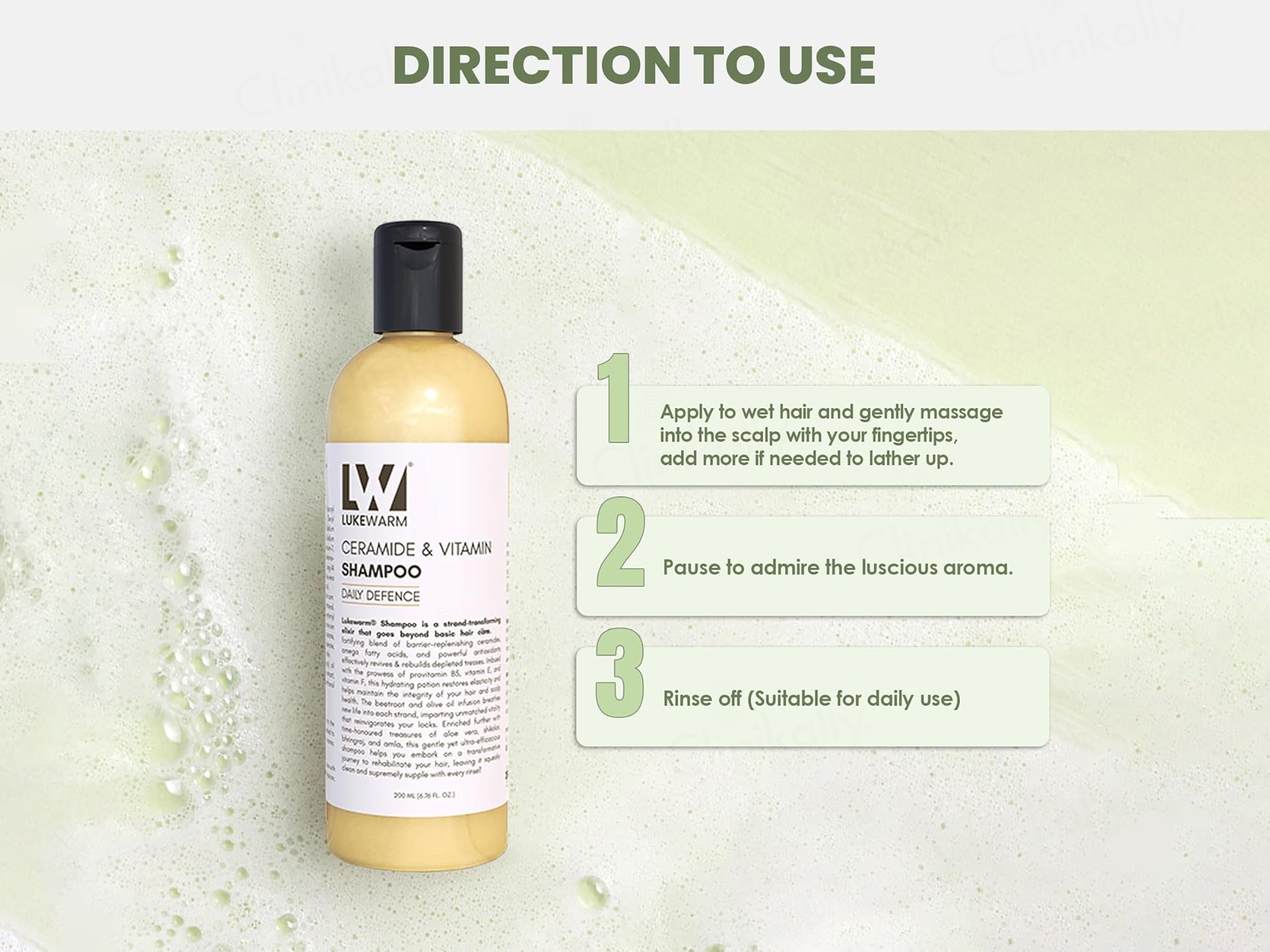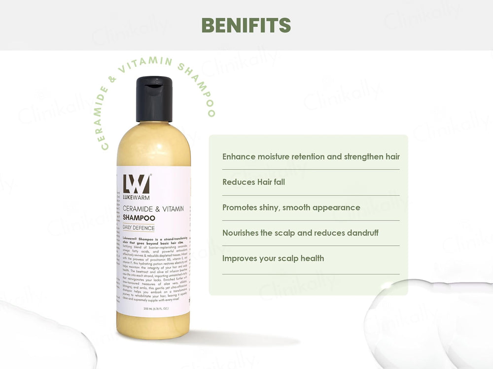 Lukewarm Ceramide & Vitamin Daily Defence Shampoo is used to repair, protect, and strengthen damaged hair while enhancing softness and moisture retention.