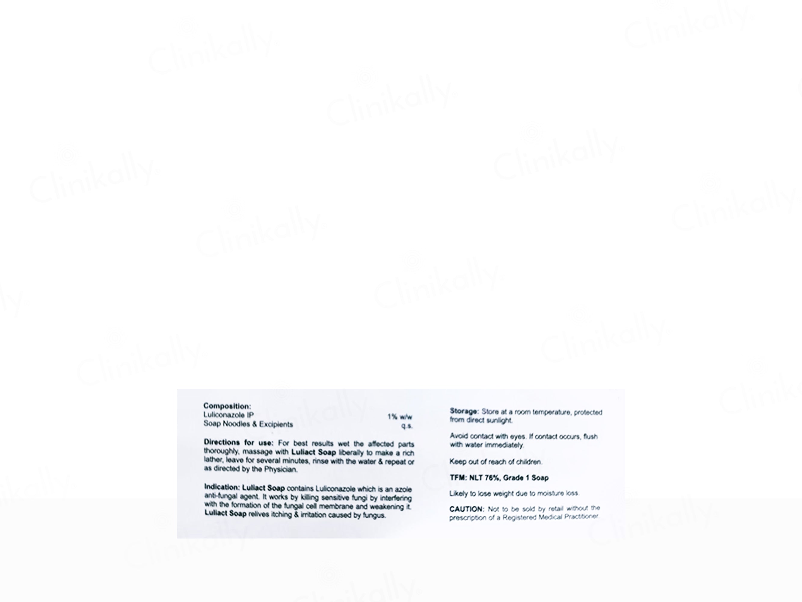 Luliact Medicated Soap is a dermatologist-recommended antifungal cleansing bar formulated with Luliconazole to treat and prevent fungal skin infections. This medicated soap helps eliminate fungi responsible for conditions such as ringworm, athlete’s foot, and jock itch. It gently cleanses the skin while reducing itching, redness, and irritation associated with fungal infections. Suitable for regular hygienic use as advised, it helps maintain a healthy, fungus-free skin environment.